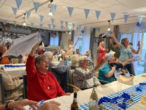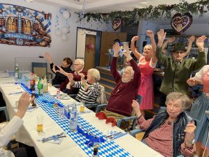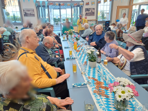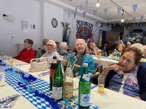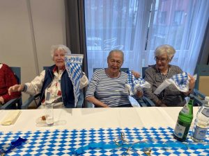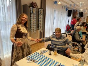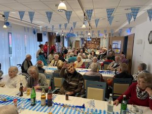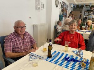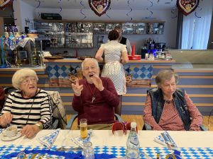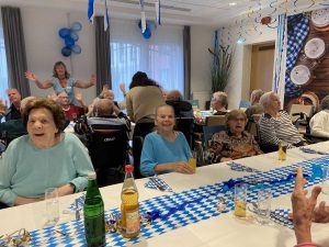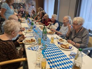 Das Oktoberfest darf im Jahresverlauf einfach nicht fehlen. Die Einrichtungsleitung, Frau Gemke, eröffnete im reich geschmückten Restaurant das Fest am 03. Oktober mit dem traditionellen Fassanstich. Sportlich ging es weiter vom Ententanz über den Schuhplattler bis hin zu Schunkeleinlagen zur passenden Musik. Bei einem Schätzspiel konnte als Hauptpreis ein Restaurantgutschein gewonnen werden, was angeregte Diskussionen über die richtige Anzahl Salzbrezeln hervorrief. Auch Anekdoten und Wissenswertes vom Münchener Original wurden zum Besten gegeben. Als Abschluss zum Abendessen genossen die Festbesucher dann Leberkäse mit süßem Senf, Kartoffelsalat und Laugenstangen.