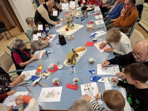 Schon wieder waren sie zu Gast, die Kinder des Kindergartens „LebensSpielRaum“. Weil die diesjährigen Vorschulkinder schon einmal zu Besuch waren, benötigte es kaum eine Aufwärmzeit für die Kinder. Schnell wurden die Kontakte untereinander wieder aufgeweckt, zum gemeinsamen Singen von St. Martinsliedern, Malen und Kürbiscremesuppe essen.