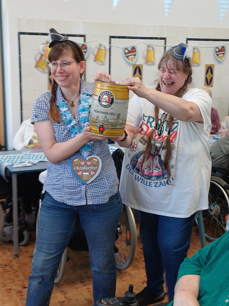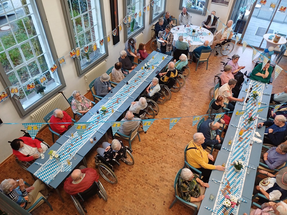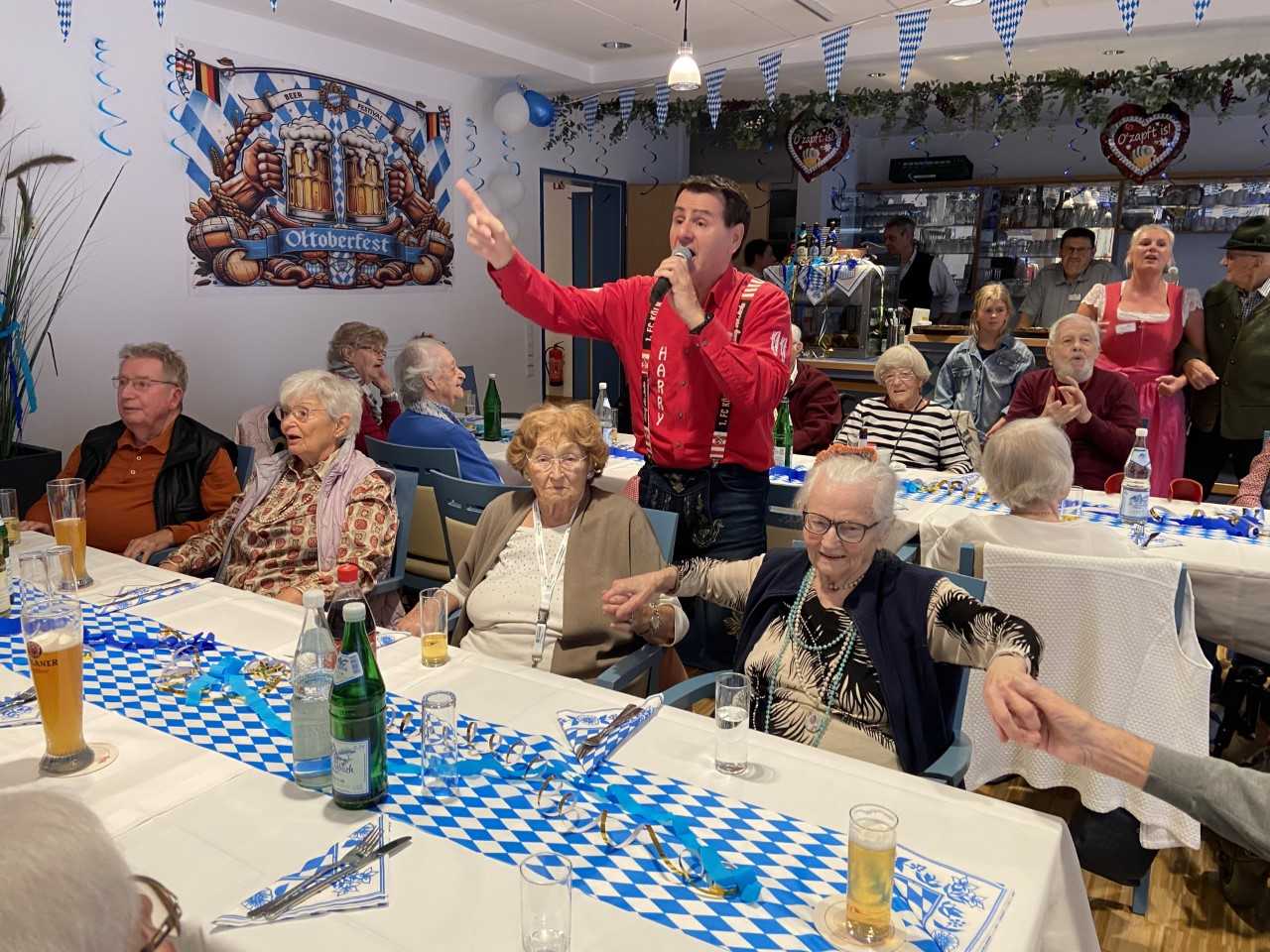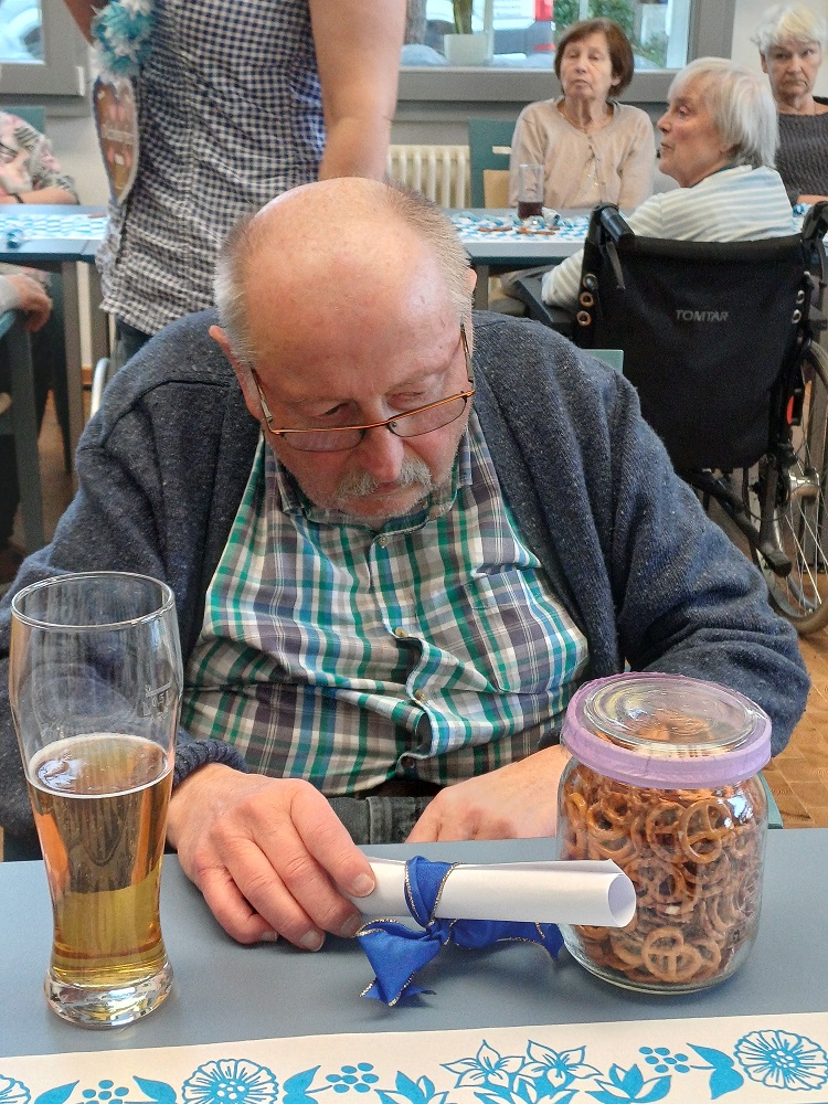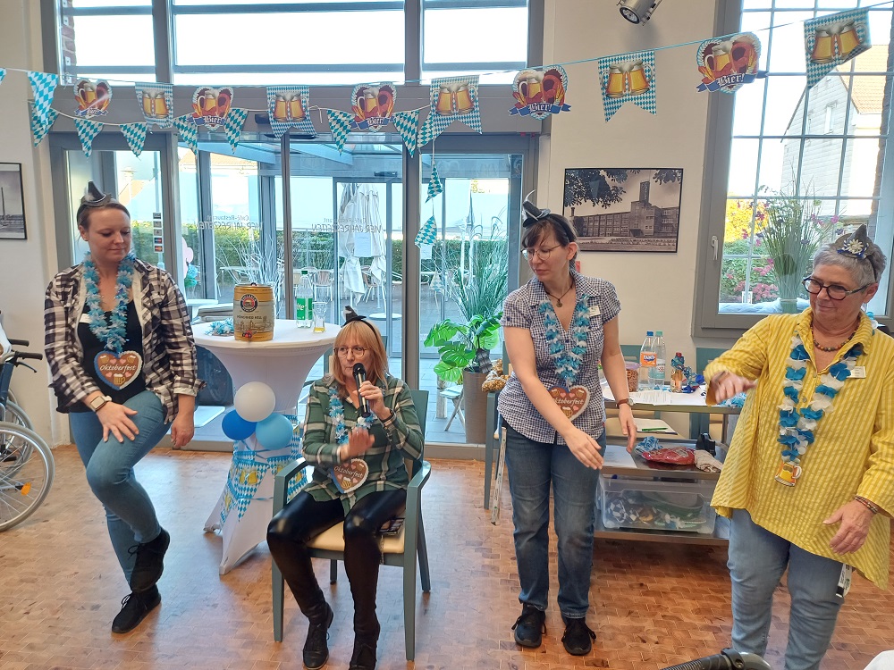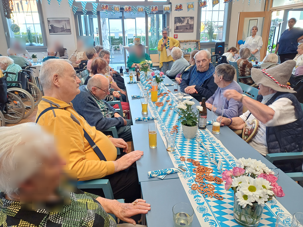 Das Oktoberfest darf im Jahresverlauf einfach nicht fehlen. Die Einrichtungsleitung, Frau Gemke, eröffnete im reich geschmückten Restaurant das Fest am 03. Oktober mit dem traditionellen Fassanstich. Sportlich ging es weiter vom Ententanz über den Schuhplattler bis hin zu Schunkeleinlagen zur passenden Musik. Bei einem Schätzspiel konnte als Hauptpreis ein Restaurantgutschein gewonnen werden, was angeregte Diskussionen über die richtige Anzahl Salzbrezeln hervorrief. Auch Anekdoten und Wissenswertes vom Münchener Original wurden zum Besten gegeben. Als Abschluss zum Abendessen genossen die Festbesucher dann Leberkäse mit süßem Senf, Kartoffelsalat und Laugenstangen.