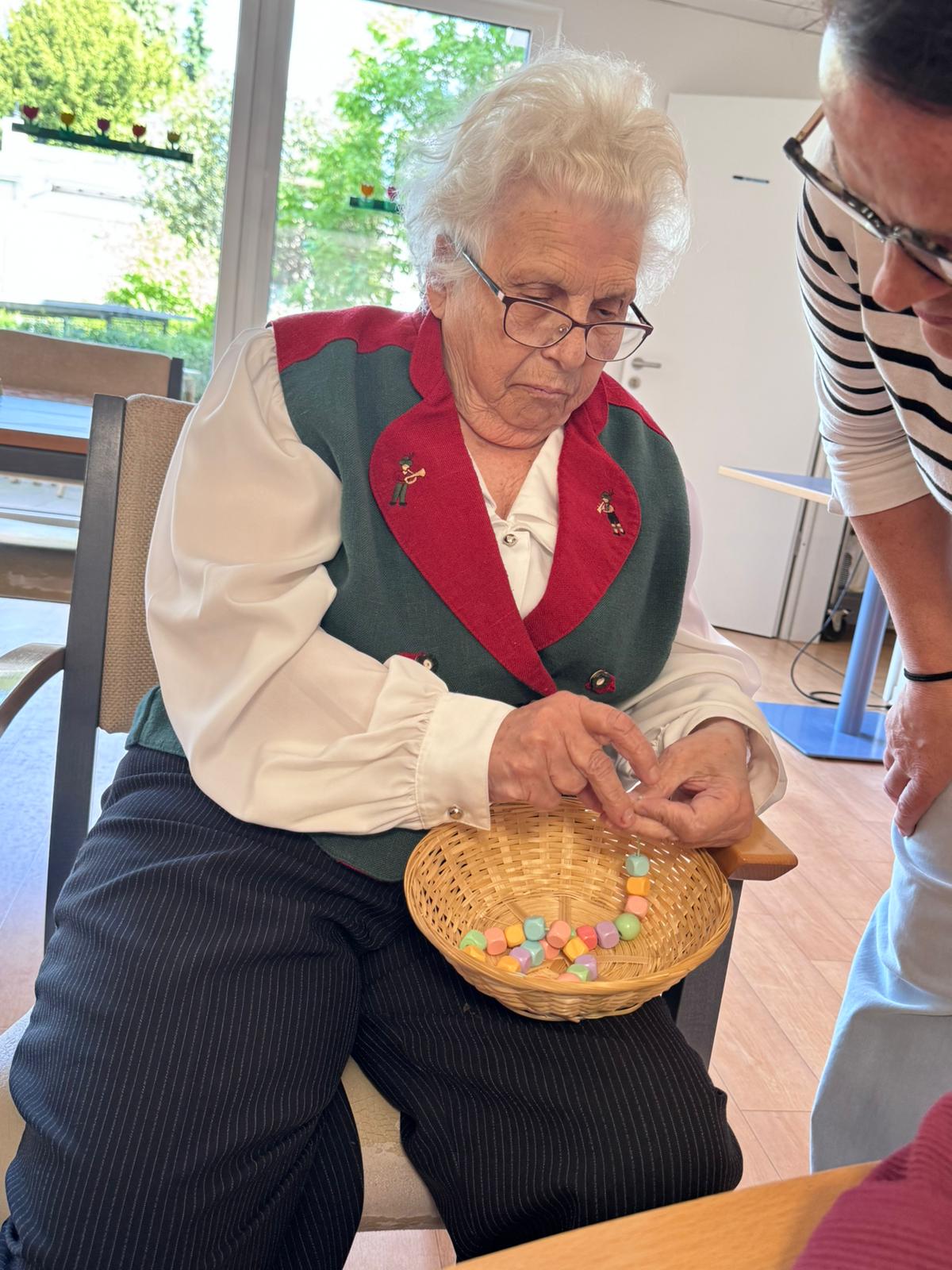Im Nachmittagsangebot haben die Gäste der Tagespflege Hilden Perlenketten selber gemacht. Mit Begeisterung waren alle dabei und konnten so ein schönes Geschenk mit nach Hause nehmen – und somit auch ein Stück weit Begeisterung an den heutigen Nachmittag.