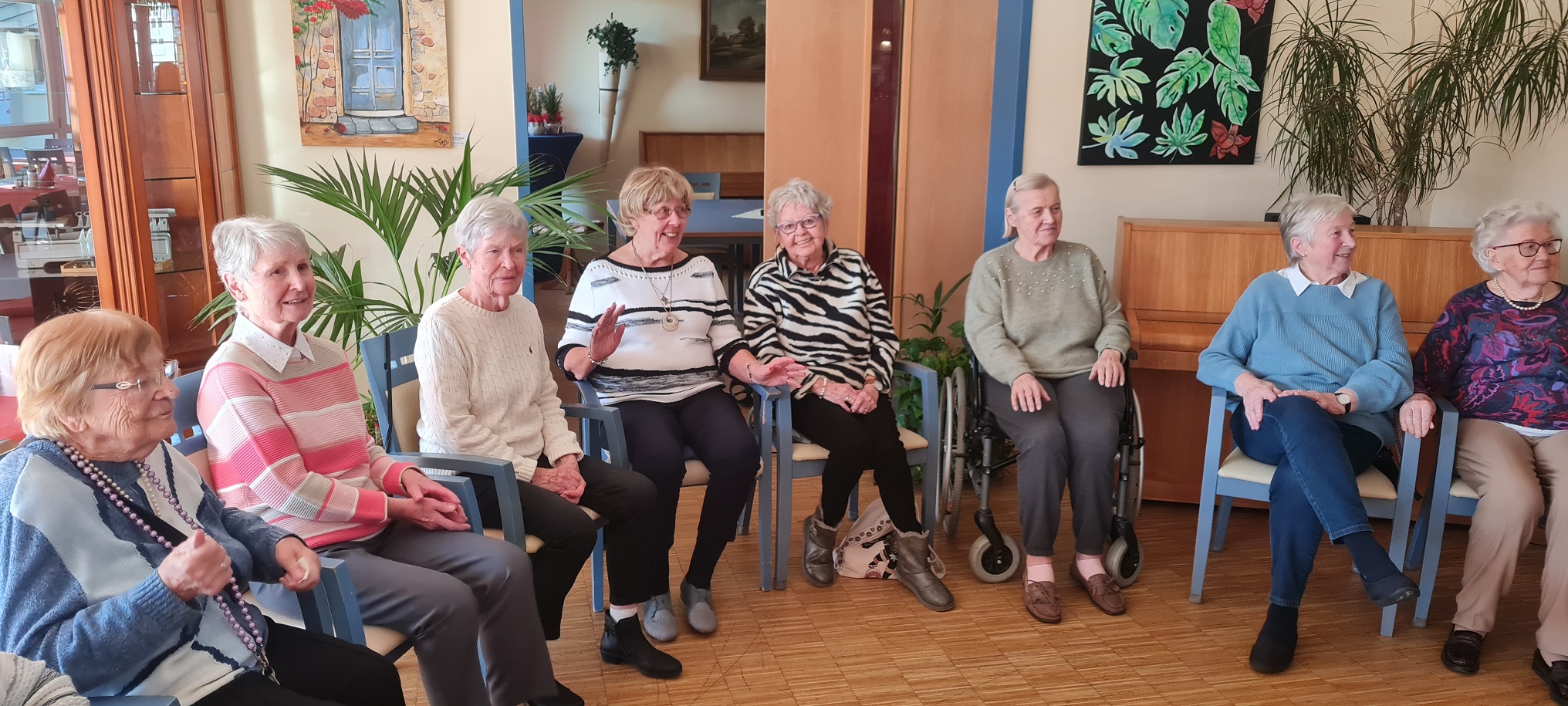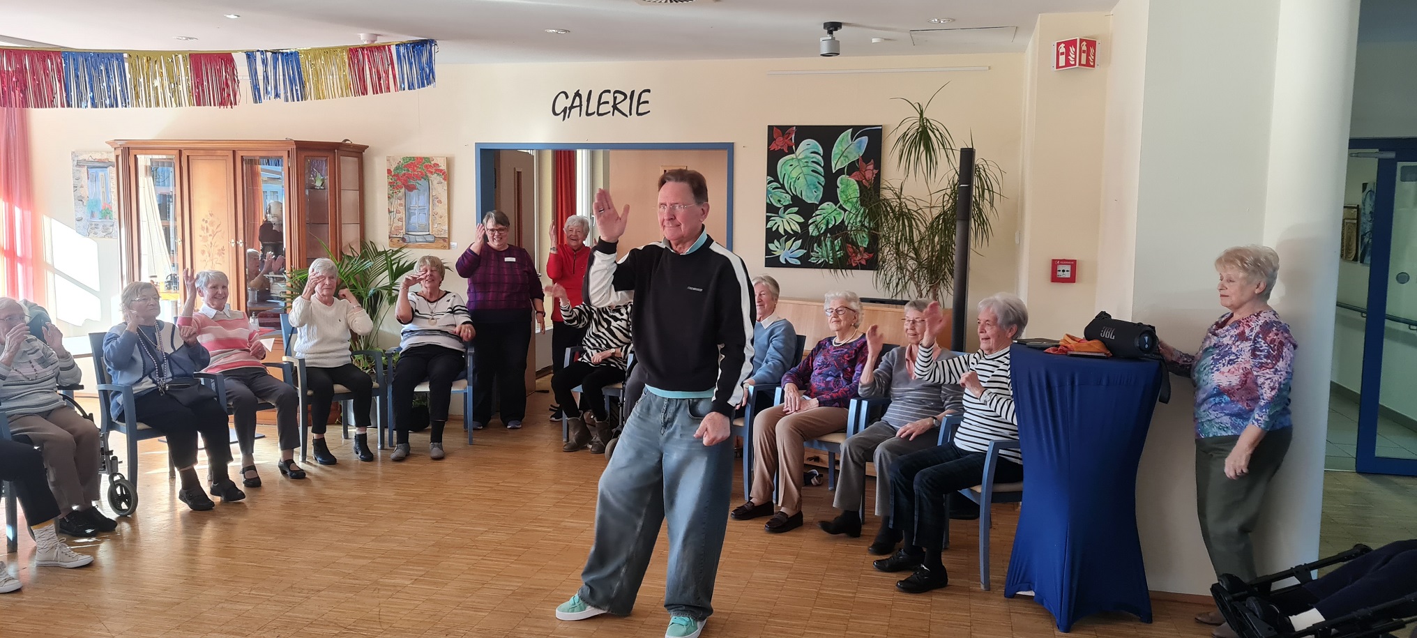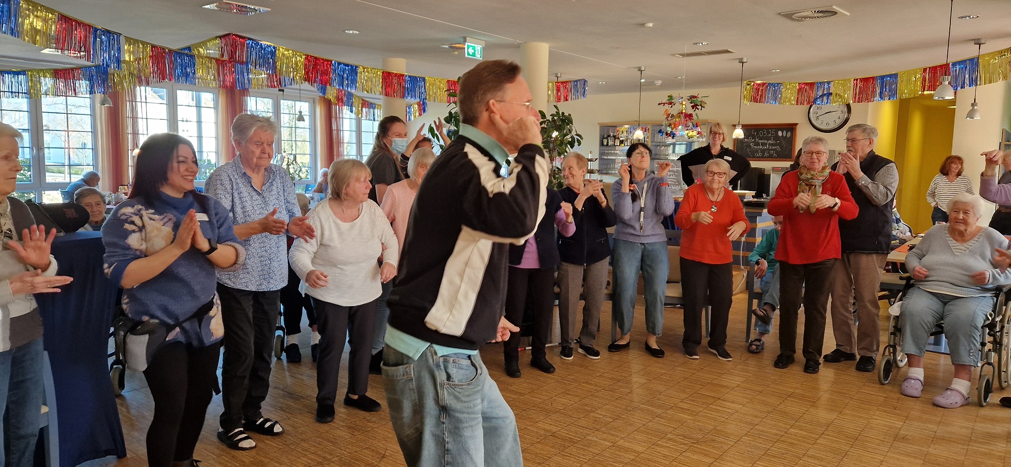 Wir bekamen den Tanzlehrer Georg Stallnig „geschenkt“. Er kam für über eine Stunde zu uns und sorgte im Handumdrehen für eine tolle Stimmung. Jede und jeder konnte mitmachen, auch unsere Rollstuhlfahrenden wurden mit einbezogen. Viele Mitarbeitende machten mit und tanzten begeistert mit.