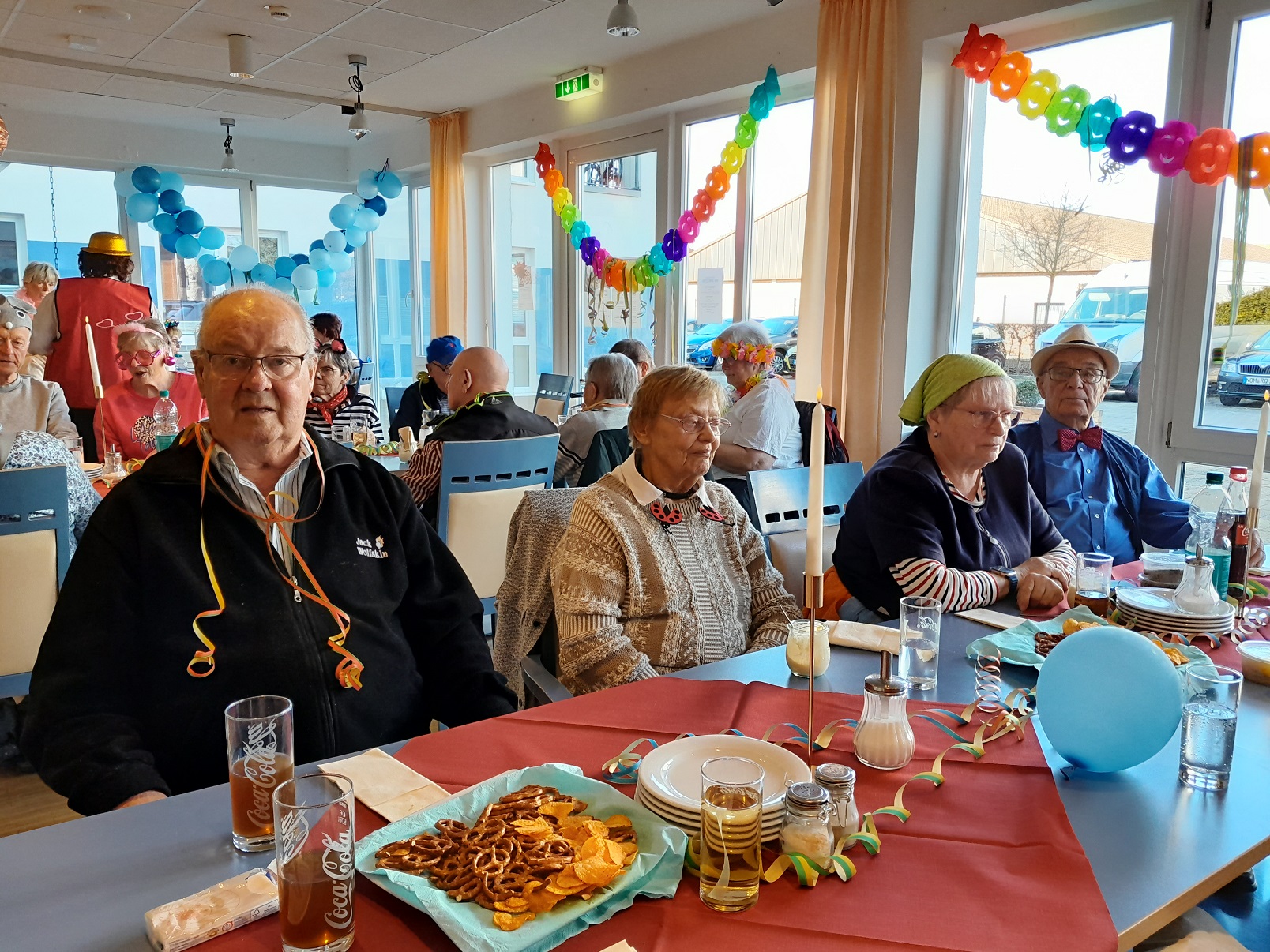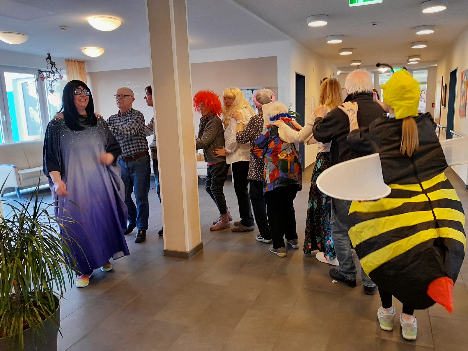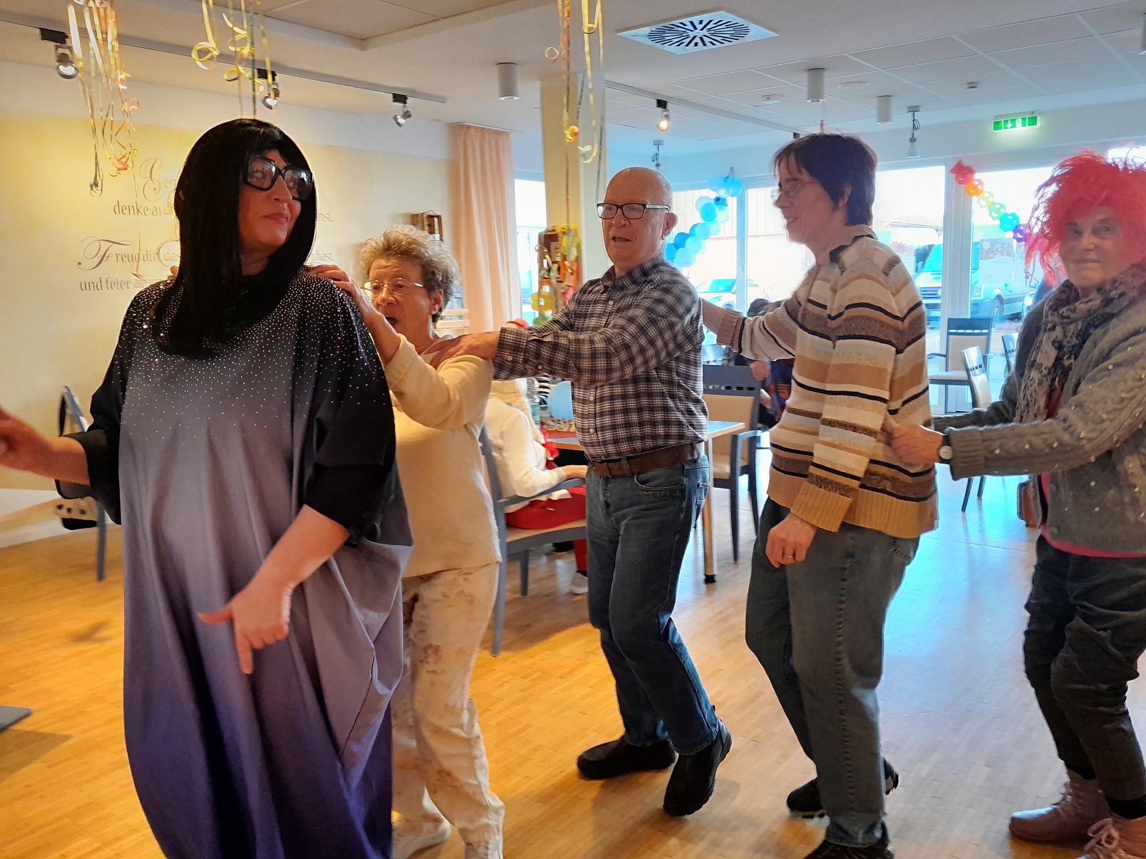 Tagespflege und Betreutes Wohnen: Unsere diesjährige Karnevalsfeier stand unter dem Motto „Hitparade mit Dieter Thomas Heck“. Gleich als erste traten die Wildecker Herzbuben auf, was gleich zu einem großen fröhlichen Gegröle im Publikum führte. Schließlich sieht man das Personal nicht so häufig in Kostümen. Die Stimmung war gleich zu Beginn aufgeheizt und heiter. Alle sangen mit, schunkelten oder klatschten. So ging es auch bei den folgenden Auftritten weiter. Dieter Thomas Heck hatte auch Nana Mouskouri, Heino, Karel Gott und seine Biene Maja, Nicole, Anita und Roberto Blanco für einen Auftritt in die Show eingeladen. Sie alle sangen Lieder, bei denen sich die Seniorinnen und Senioren stimmlich und körperlich mit einbringen konnten. Schließlich kennen alle die alten Ohrwürmer. In der restlichen Zeit sorgten auch Party- und Karnevalslieder für eine feierliche Atmosphäre. Auf der Tanzfläche ging es rege zu. Und natürlich zogen wir auch wieder in einer Polonaise durch den Saal.