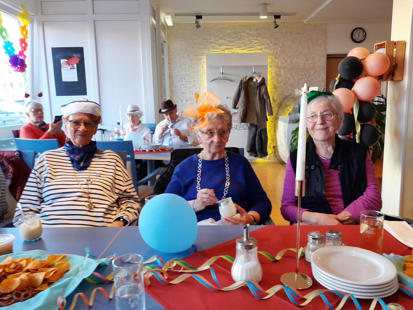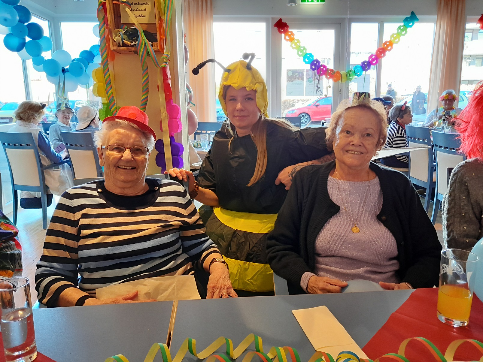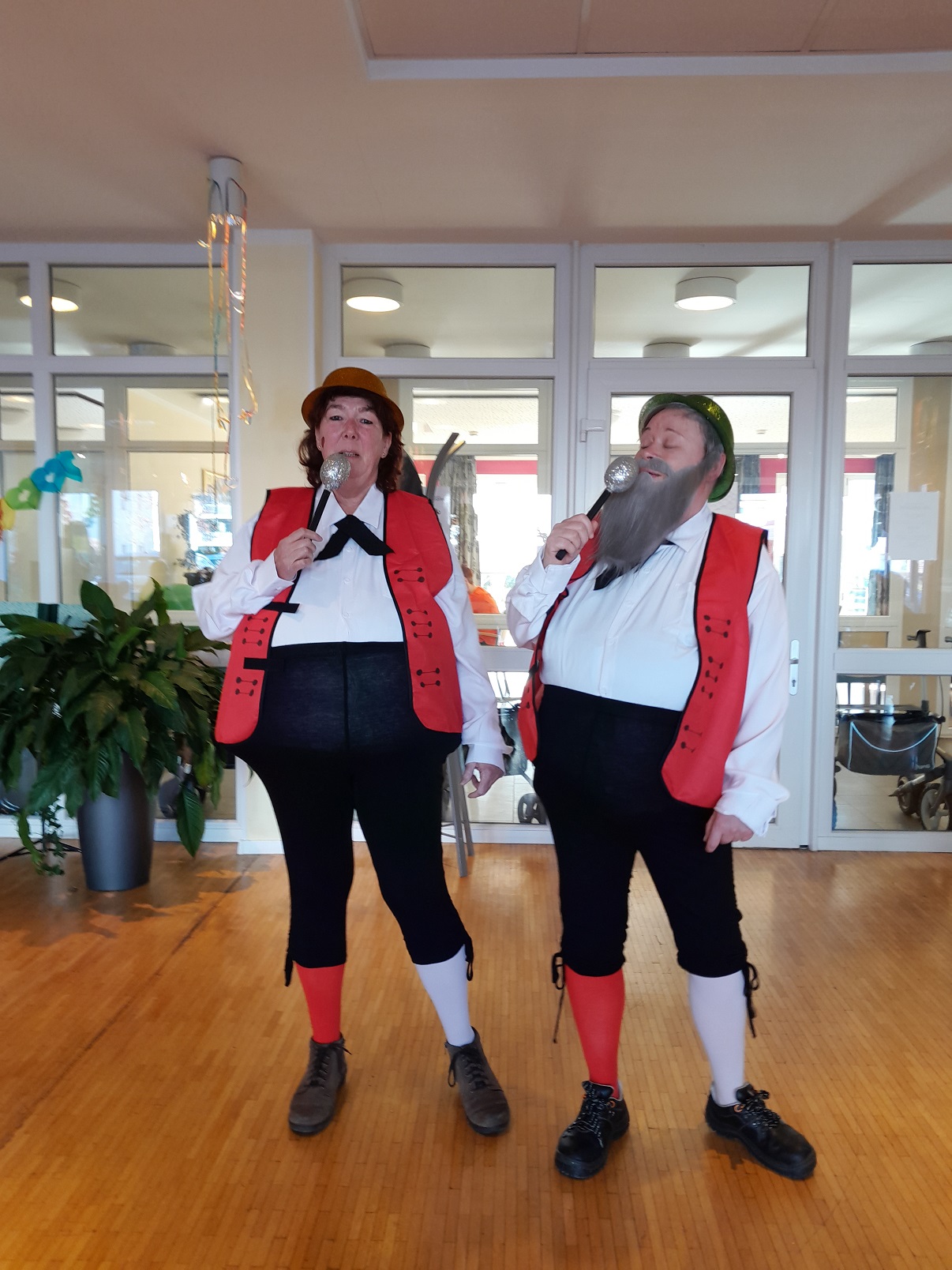 Tagespflege und Betreutes Wohnen: Unsere diesjährige Karnevalsfeier stand unter dem Motto „Hitparade mit Dieter Thomas Heck“. Gleich als erste traten die Wildecker Herzbuben auf, was gleich zu einem großen fröhlichen Gegröle im Publikum führte. Schließlich sieht man das Personal nicht so häufig in Kostümen. Die Stimmung war gleich zu Beginn aufgeheizt und heiter. Alle sangen mit, schunkelten oder klatschten. So ging es auch bei den folgenden Auftritten weiter. Dieter Thomas Heck hatte auch Nana Mouskouri, Heino, Karel Gott und seine Biene Maja, Nicole, Anita und Roberto Blanco für einen Auftritt in die Show eingeladen. Sie alle sangen Lieder, bei denen sich die Seniorinnen und Senioren stimmlich und körperlich mit einbringen konnten. Schließlich kennen alle die alten Ohrwürmer. In der restlichen Zeit sorgten auch Party- und Karnevalslieder für eine feierliche Atmosphäre. Auf der Tanzfläche ging es rege zu. Und natürlich zogen wir auch wieder in einer Polonaise durch den Saal.