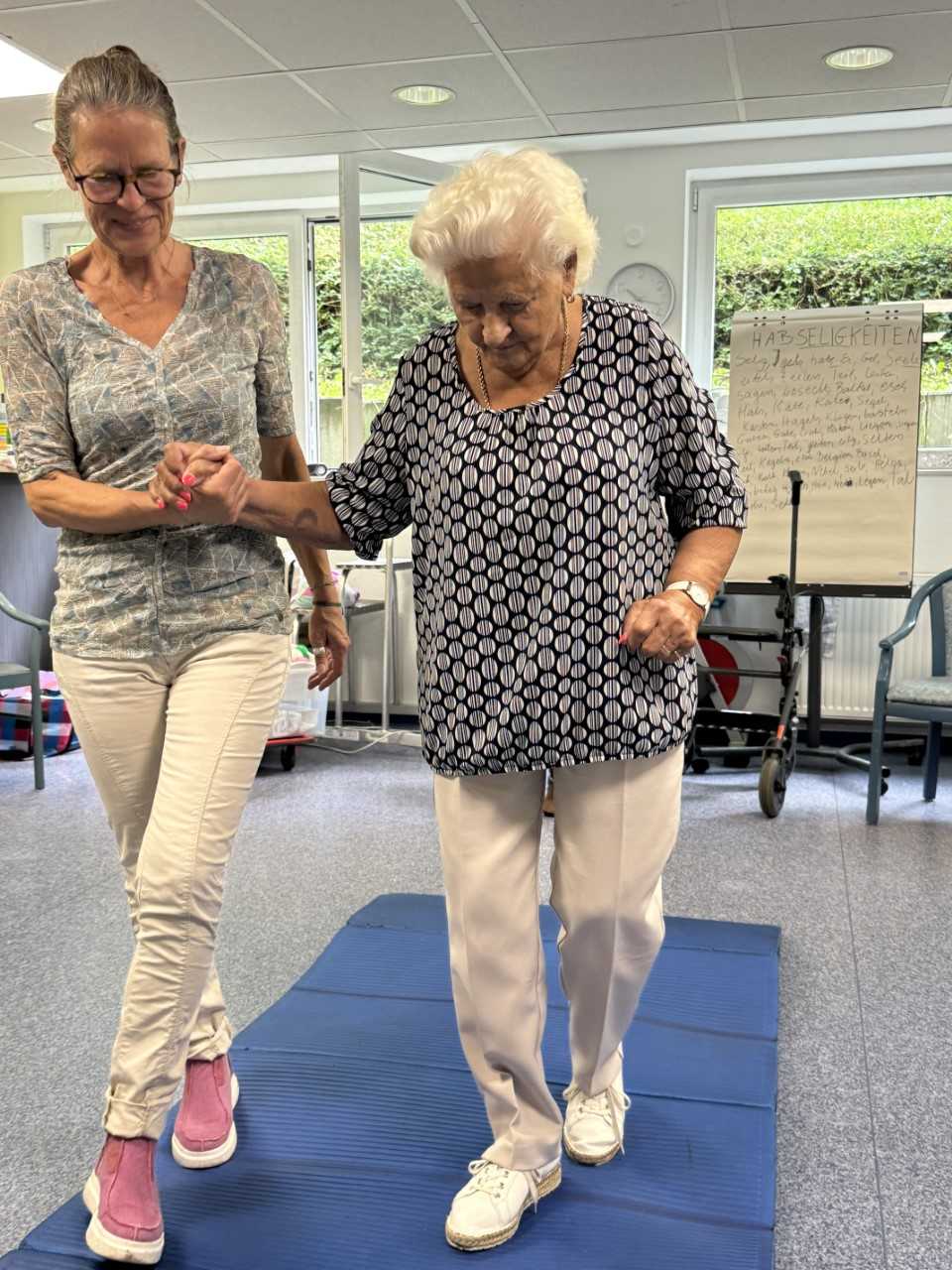 Seit 2005 verwandelt sich jeden Mittwoch unser Multifunktionsraum in ein kleines Trainingszentrum. Dann heißt es wieder „Fit bleiben und Stürzen vorbeugen!“ Das Angebot Sturzprävention ist seit Jahren ein fester Bestandteil in unserem Wochenplan und bei unseren Bewohnerinnen und Bewohnern sehr geschätzt.