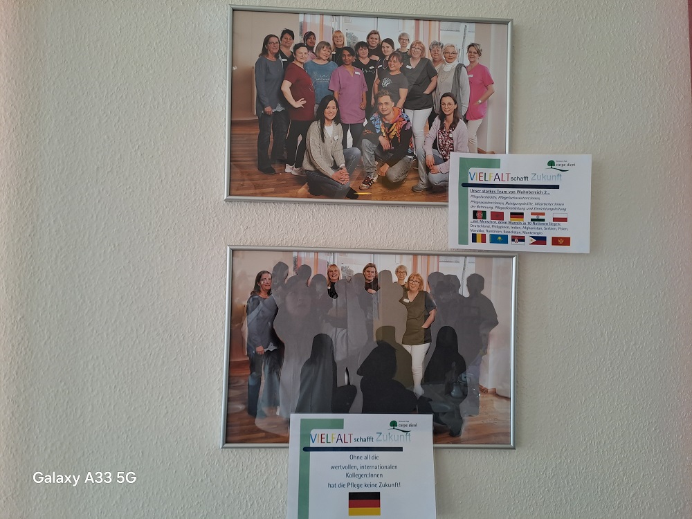 Die Fotoausstellung bietet die Gelegenheit, unsere internationalen Mitarbeitenden sichtbar zu machen. Besonders eindrucksvoll ist die Gegenüberstellung zweier Gruppenfotos: Das erste Bild zeigt die fast vollständige Besetzung eines Wohnbereichs. Das zweite Bild ist identisch – mit einer entscheidenden Ausnahme: Die internationalen Mitarbeitenden wurden geschwärzt. Das Ergebnis ist eindeutig – es fehlen nicht nur einige wenige, sondern fast drei Viertel der Belegschaft. Diese visuelle Darstellung macht eindringlich klar, wie unentbehrlich unsere internationalen Kolleginnen und Kollegen für den täglichen Betrieb und die Versorgung unserer Bewohner*innen sind.