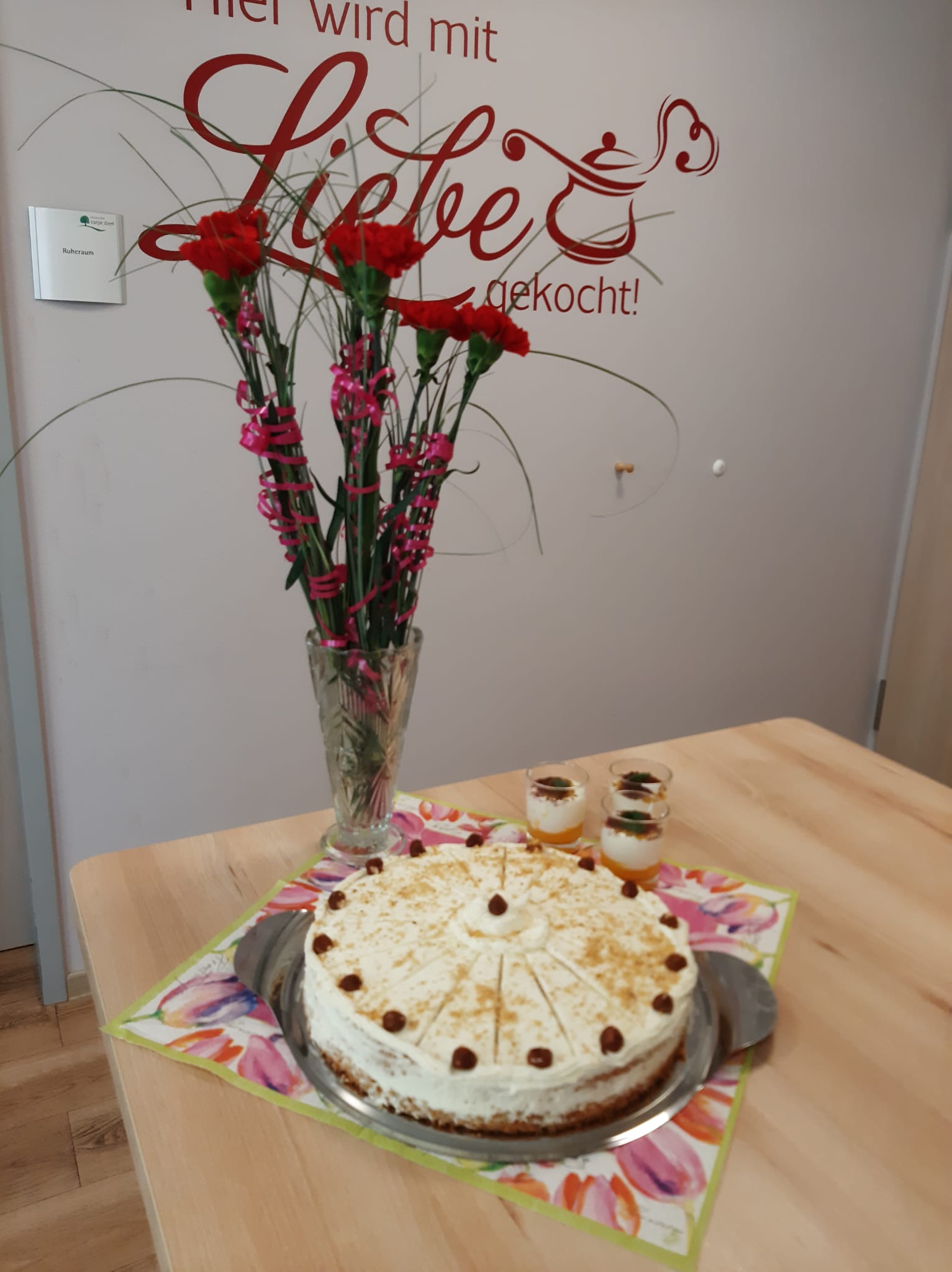 Heute holten wir den internationalen Frauentag in unserer Tagespflege nach. Alle anwesenden Frauen wurden mit einer roten Nelke geehrt – ein klassisches Symbol der Wertschätzung. Passend zum Anlass gab es ein tolles Mango-Dessert und zum Kaffee eine selbstgebackene Nusstorte.