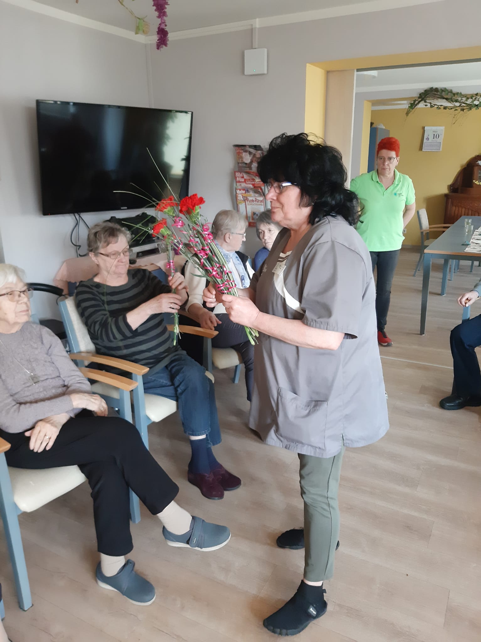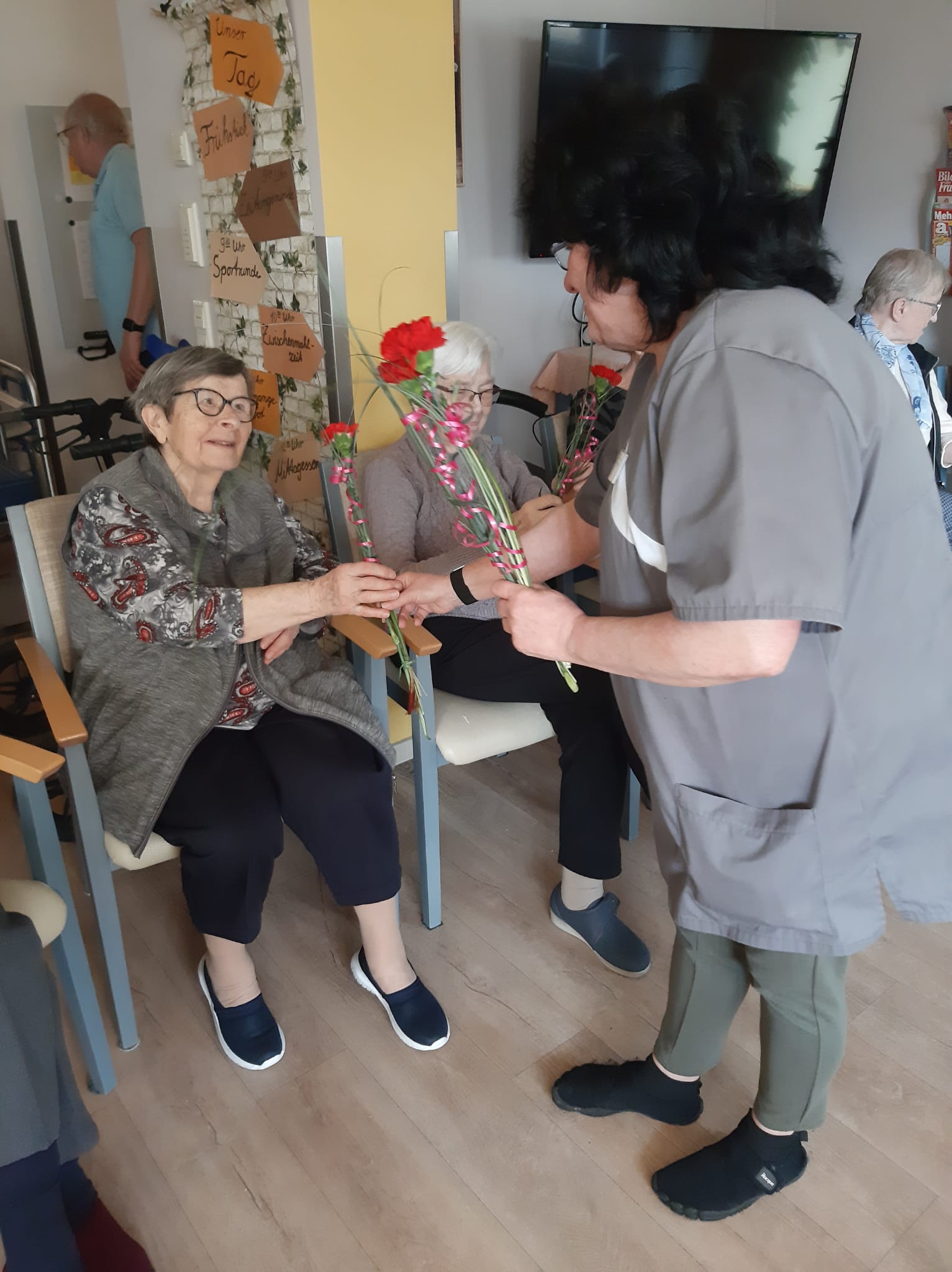 Heute holten wir den internationalen Frauentag in unserer Tagespflege nach. Alle anwesenden Frauen wurden mit einer roten Nelke geehrt – ein klassisches Symbol der Wertschätzung. Passend zum Anlass gab es ein tolles Mango-Dessert und zum Kaffee eine selbstgebackene Nusstorte.