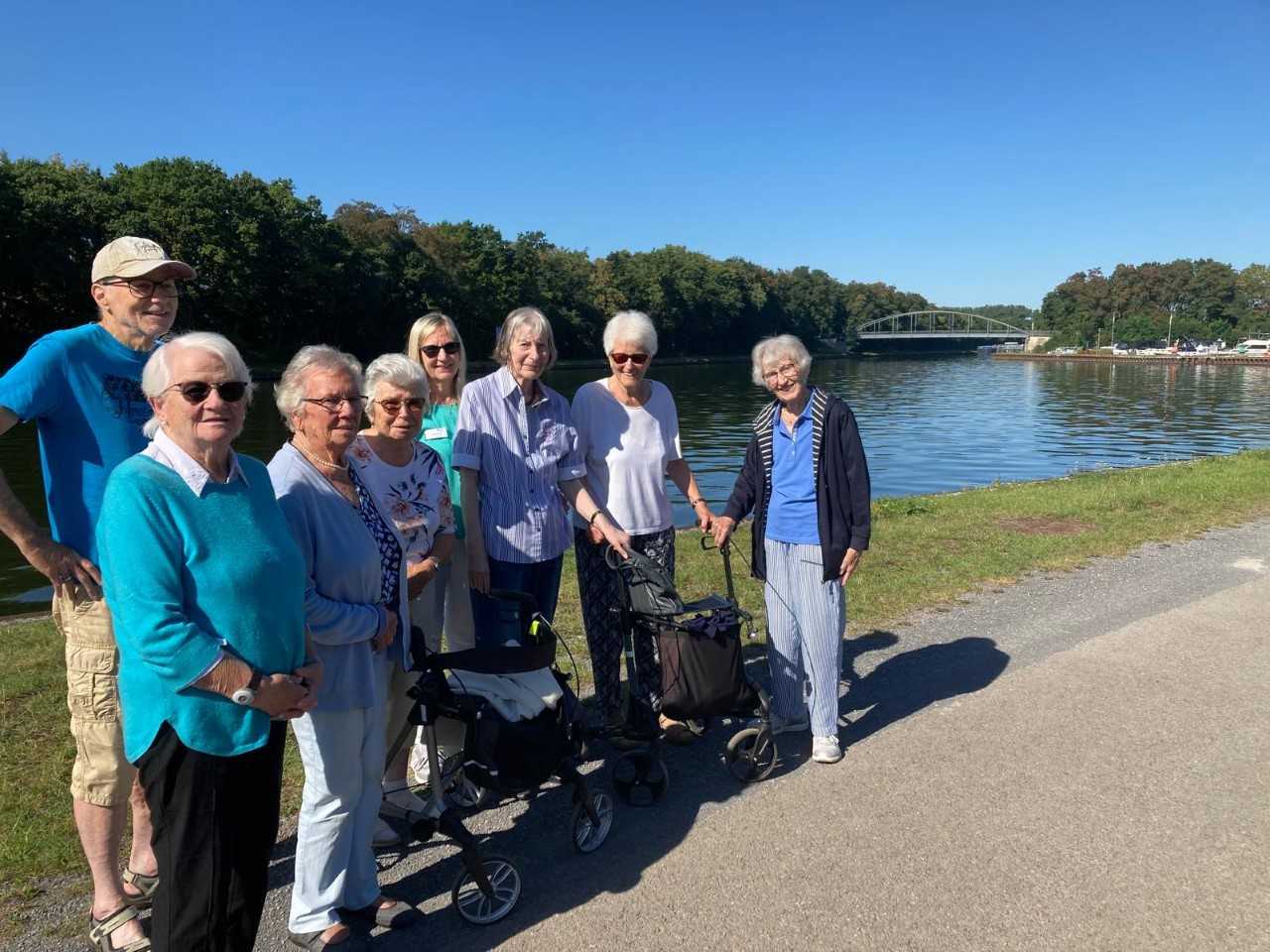 Die Gäste und Mitarbeitenden der Tagespflege machten sich gut gelaunt auf den Weg. Sie genossen das Gehen mit Blick auf den Mittellandkanal und Umgebung, bevor sich alle dann an der Gaststätte „Zum Hafenblick“ niederließen und ein kühles Getränk genossen.