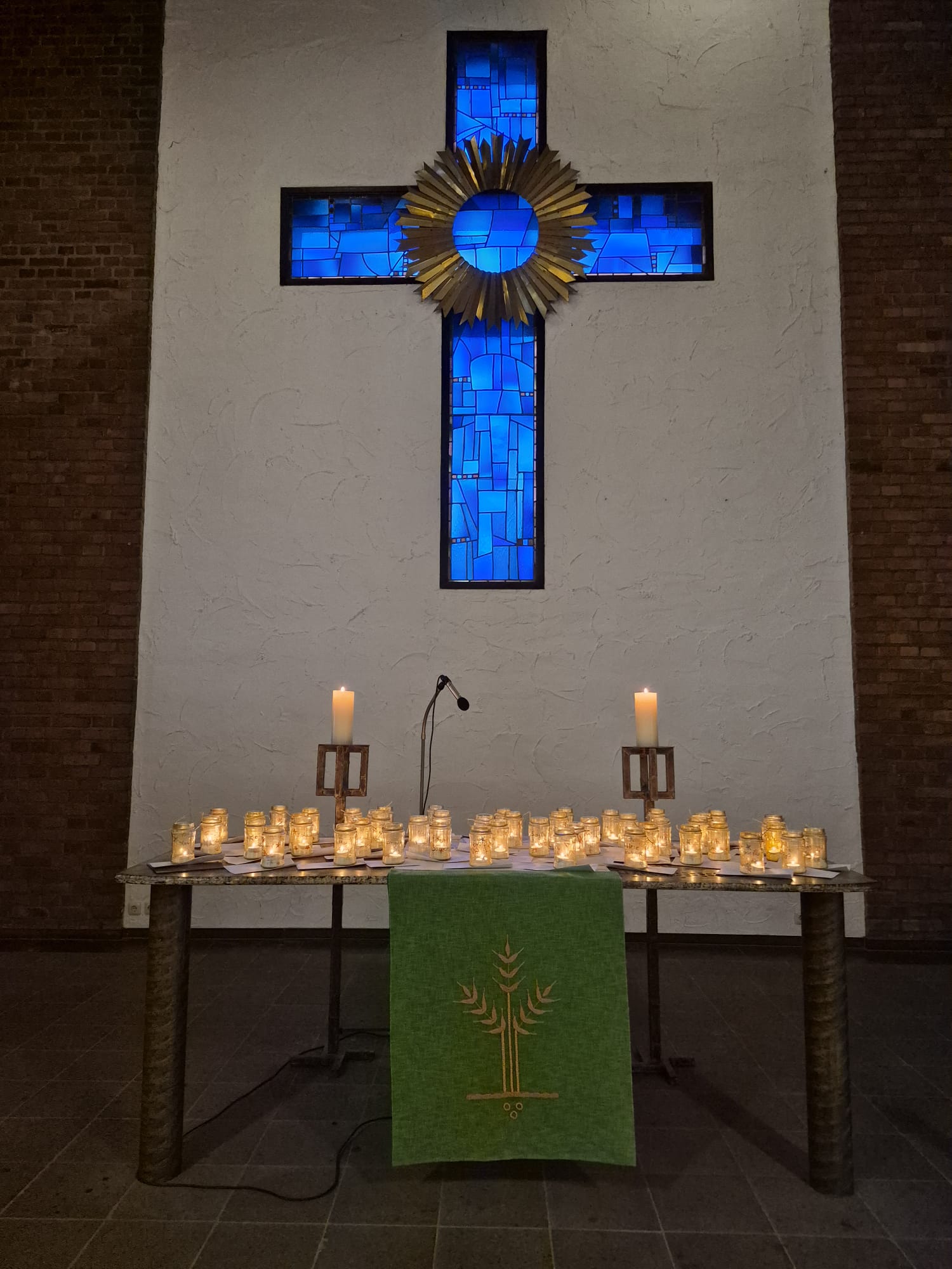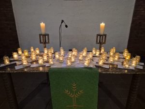 Nicht nur betroffene Angehörige waren in der Kirche, auch viele interessierte Menschen, die man durch das Netzwerk in Würselen oder einfach als Gäste unserer Veranstaltungen im Café kennengelernt hat. Die Rückmeldungen nach der Andacht beim gemeinsamen Kaffee trinken waren sehr herzlich und auch tränenreich. In den Gesprächen nach der Andacht wurde deutlich, wie viele Menschen sich im (jüngeren) Alter auch mit dem Thema Sterben aus verschiedenen Gründen auseinander setzten, jedoch oft die Personen außerhalb des familiären Umfeldes fehlen, die einfach nur ohne zu werten zuhören.