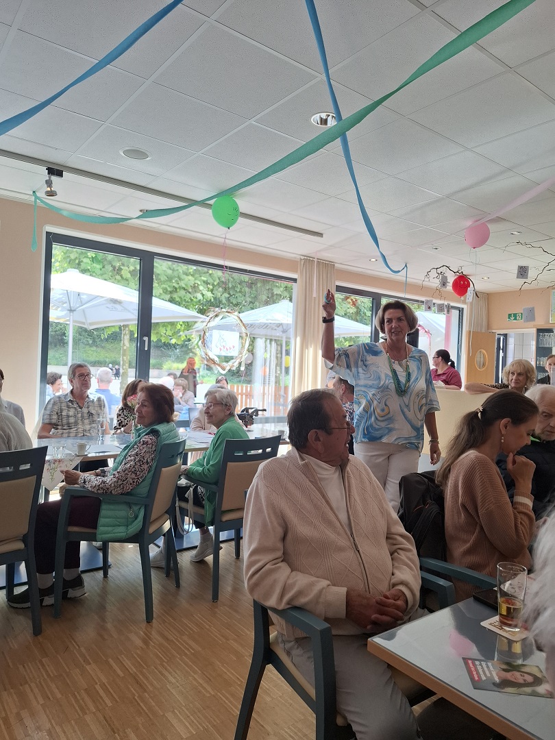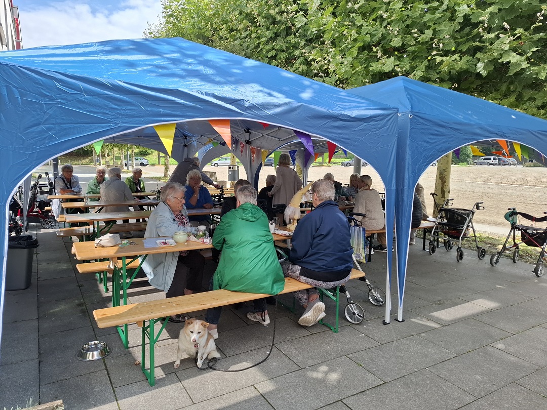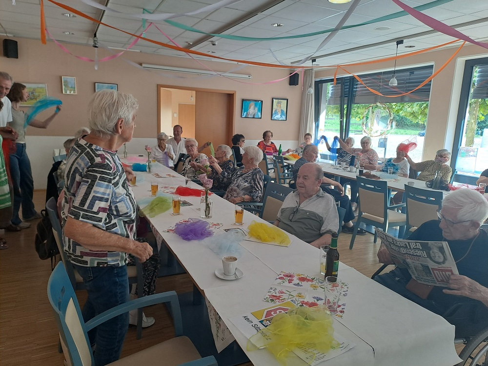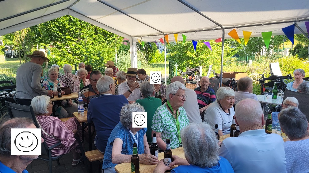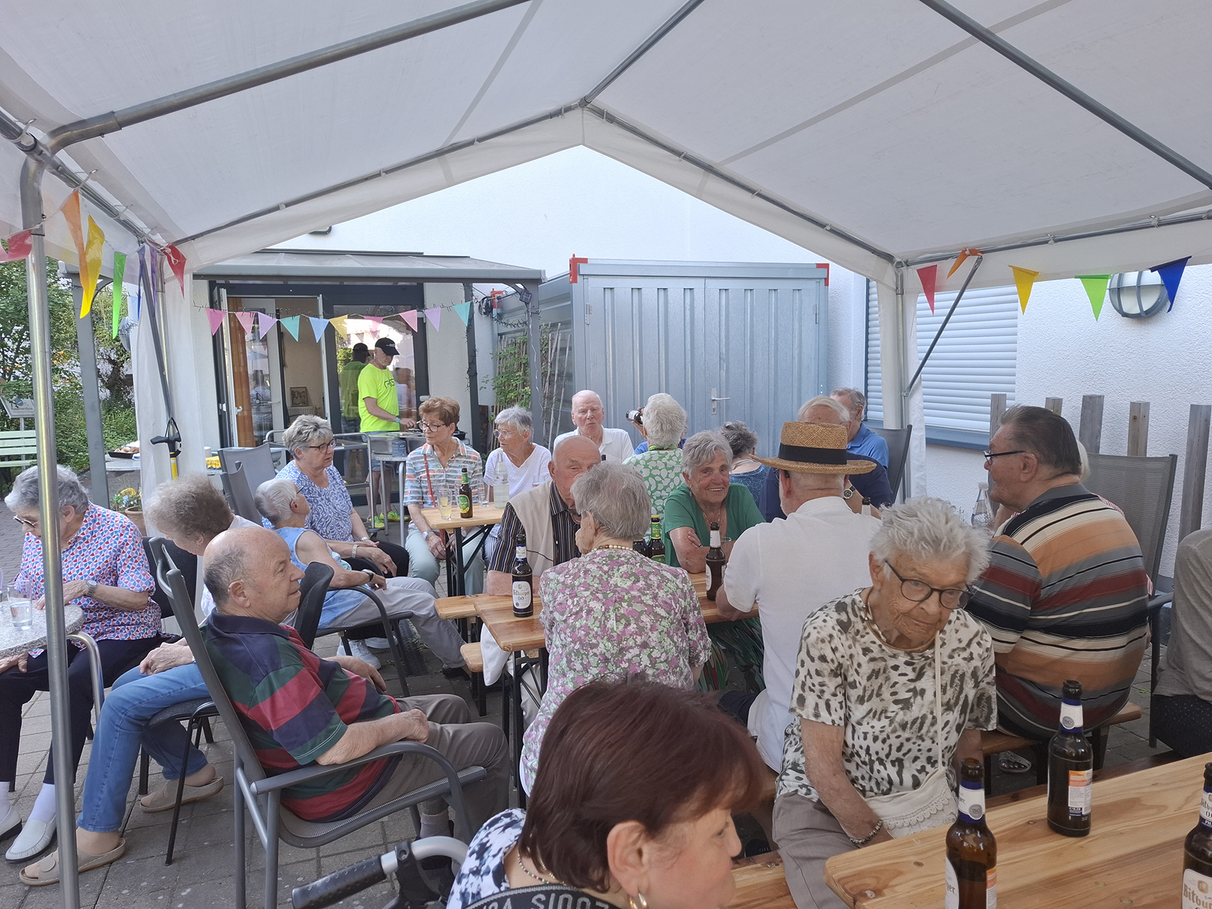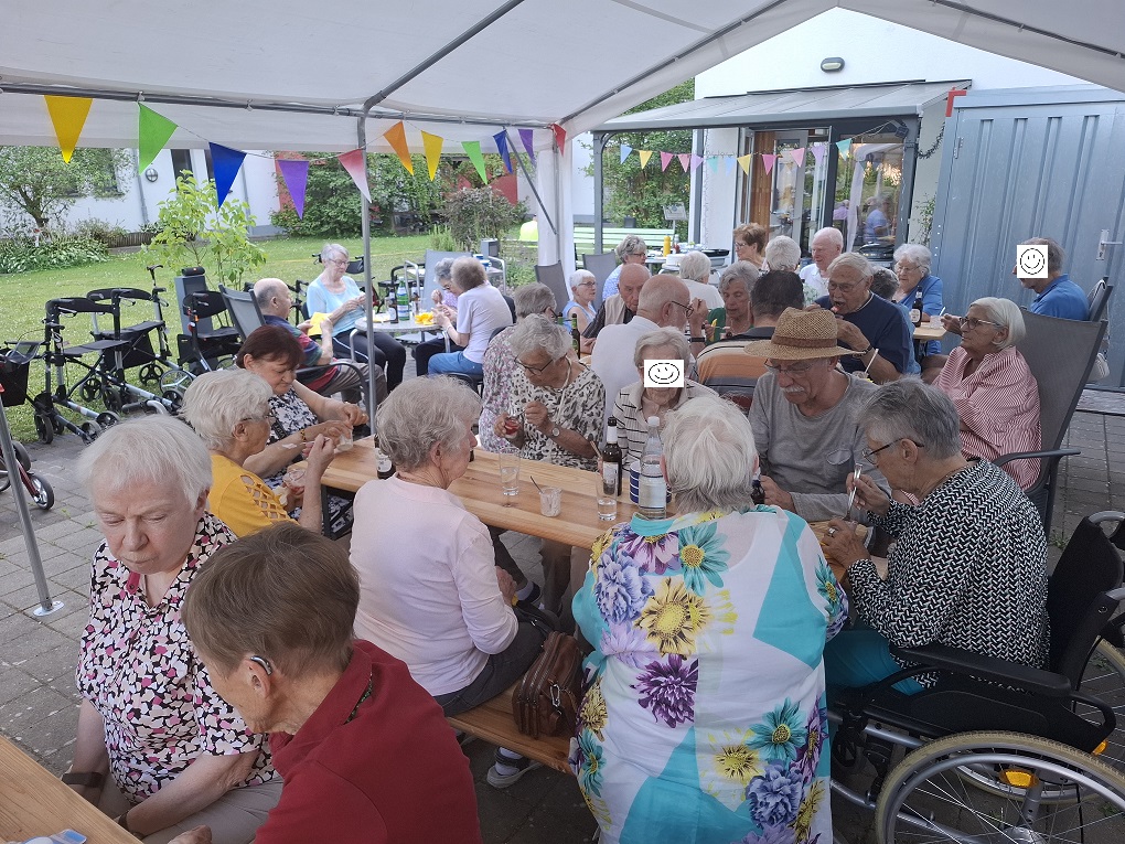 Laut dem Veranstaltungsplan für Juni war am 21.06.2025 ab 18:00 Uhr eine „Mitbring-Party“ geplant. Die Gäste aus dem Stationären Bereich und dem Betreuten Wohnen brachten jeweils das mit, worauf sie Lust hatten. Gute Laune, Hunger, Freude an der Gesellschaft, Durst, Schnäpschen, Salate, Nachtisch, Brötchen oder einfach alles, wonach ihnen der Sinn stand. Die Köstlichkeiten vom Grill und das erfrischende Bier wurden zuvor in der Küche bestellt, sodass der warme Sommerbeginn in fröhlicher Runde auf unserer Gartenterrasse in vollen Zügen genossen werden konnte.