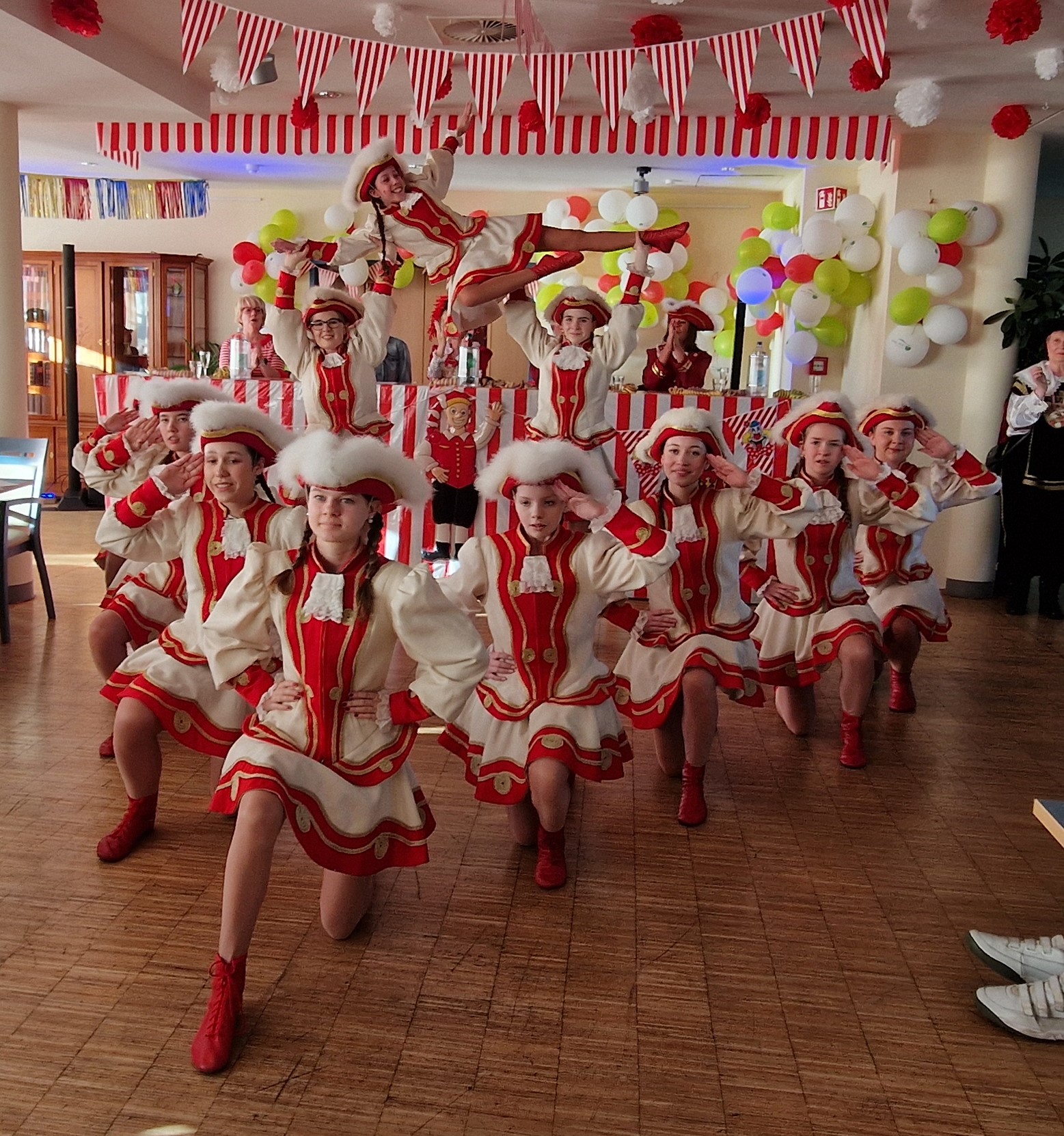 Danach zog das Prinzenpaar, samt Adjutant, Präsident und einer Tanzgarde des Karnevalsauschusses Unterbach 1957 e.V. ein. Diesen Auftritt hatten wir einer Mieterin zu verdanken, die vor vielen Jahren selbst einmal Prinzessin in diesem Verein war.