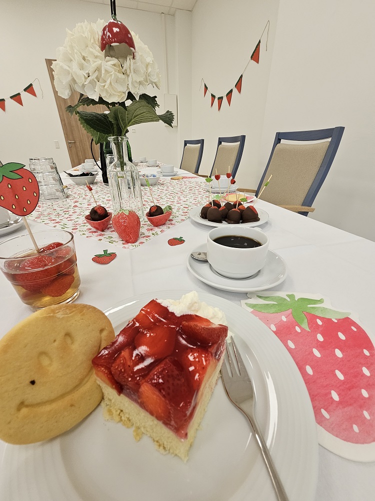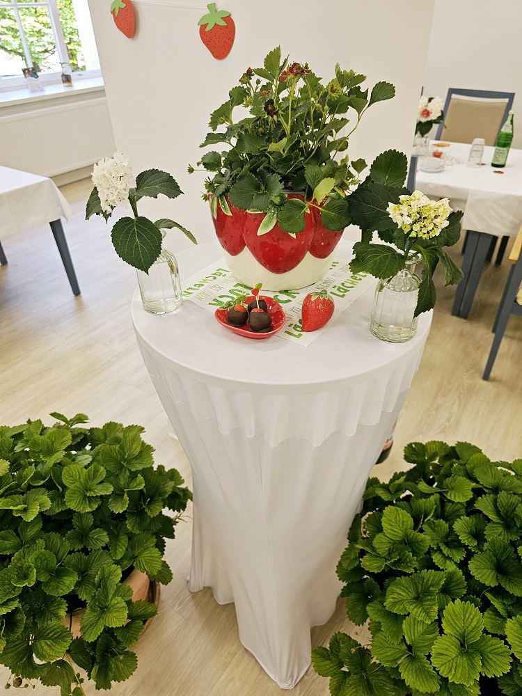 Kulinarisch verwöhnten wir unsere Gäste mit einer Vielzahl an Erdbeer-Genüssen: frische Erdbeertorte mit Sahne, erfrischende Erdbeerbowle in Gläsern und die beliebten Schokoerdbeeren, von denen keine einzige übrig geblieben ist. Das Kuchenbuffet war liebevoll dekoriert, Erdbeerengirlanden zierten die Wände und Mitarbeiter*innen in Erdbeerenkostümen sorgten für eine fröhliche Stimmung.