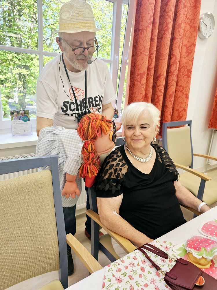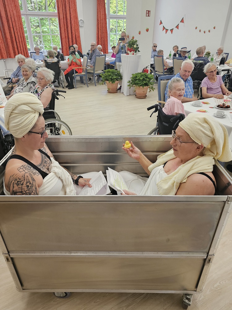 Neben den kulinarischen Highlights gab es auch ein abwechslungsreiches Rahmenprogramm. Besonders spannend war die Aufführung eines Loriot-Sketches, den unsere Pflegedienstleitung und unsere Ergotherapeutin mit viel Freude präsentierten. In einer humorvollen Szene mit Dr. Kloebner und Herrn Müller-Lüdenscheidt in der Badewanne brachten sie unsere Gäste zum Lachen und sorgten für eine ausgelassene Stimmung. TAK, Herr Wilfried Niederjohann, unser Musiker für dieses Event, verzauberte die Gäste mit seinen Liedern, Karikaturen und Scherenschnitten.