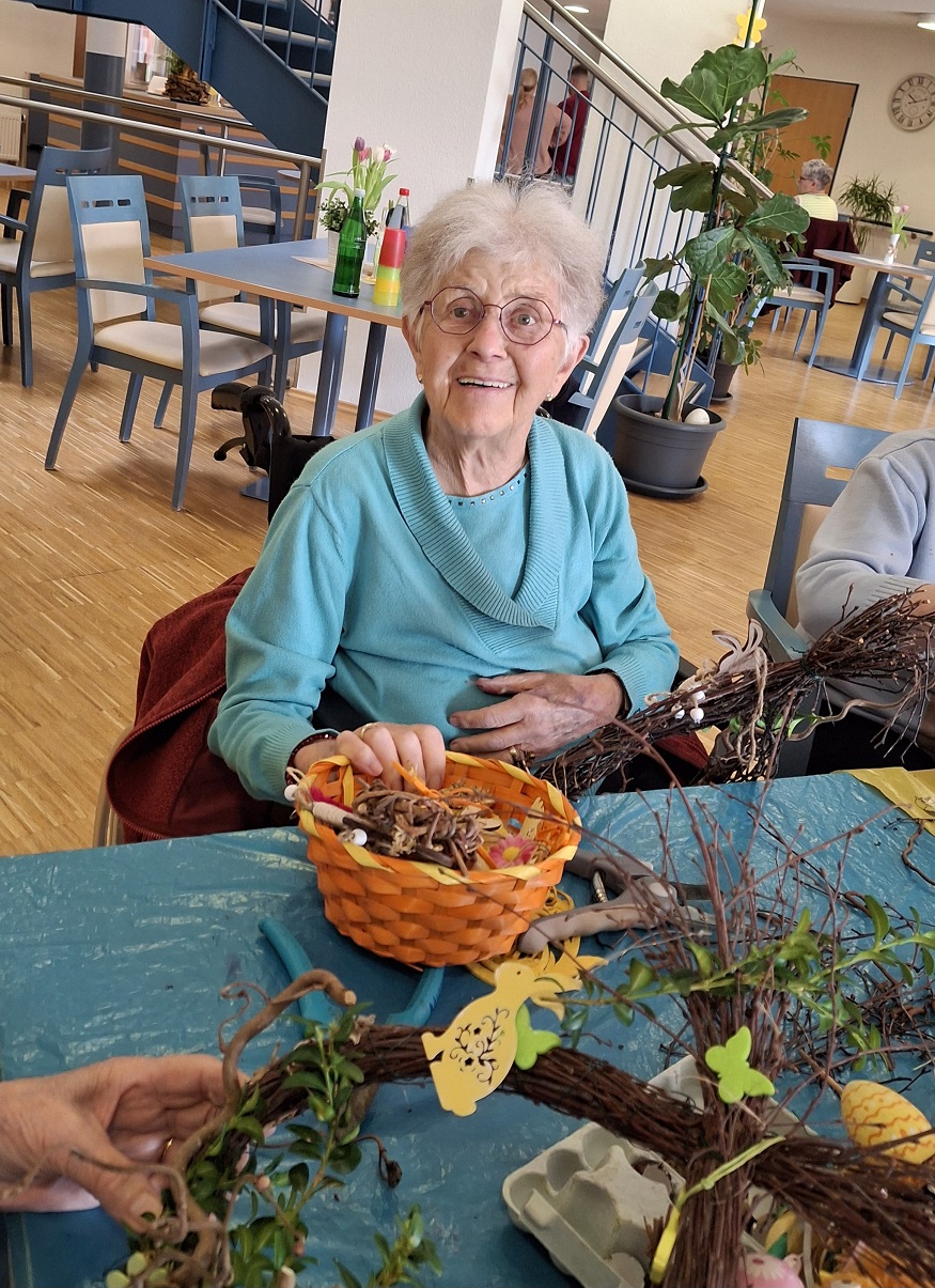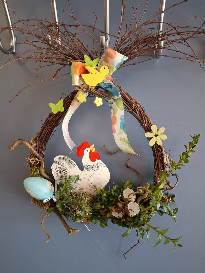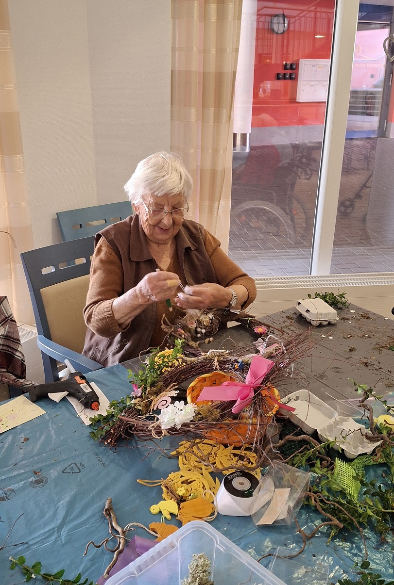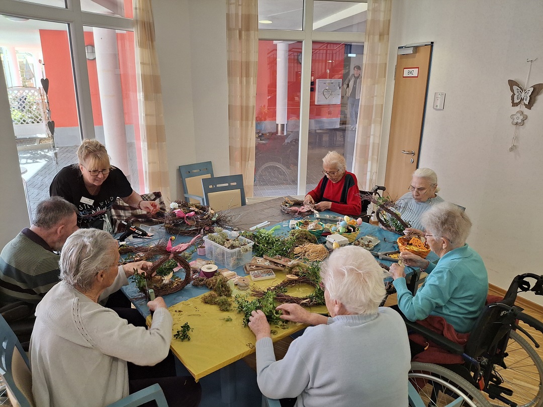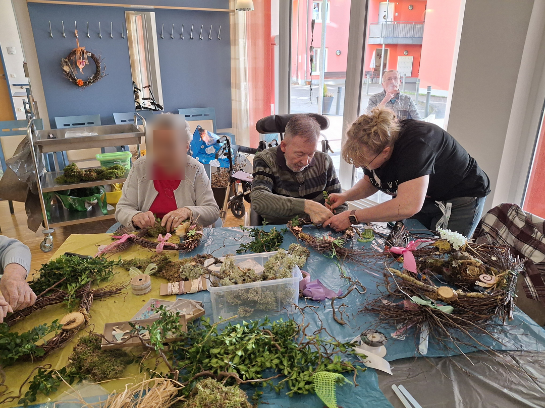 Für die Deko haben wir Frühlingskränze zum Aufhängen fertiggemacht. Mit Moos und Buchs und Dekoteilen wurde gedreht, geklebt und gebunden. Alle haben fleißig mit gemacht und waren erfreut über das schöne Ergebnis, das sich wirklich sehen lassen kann.