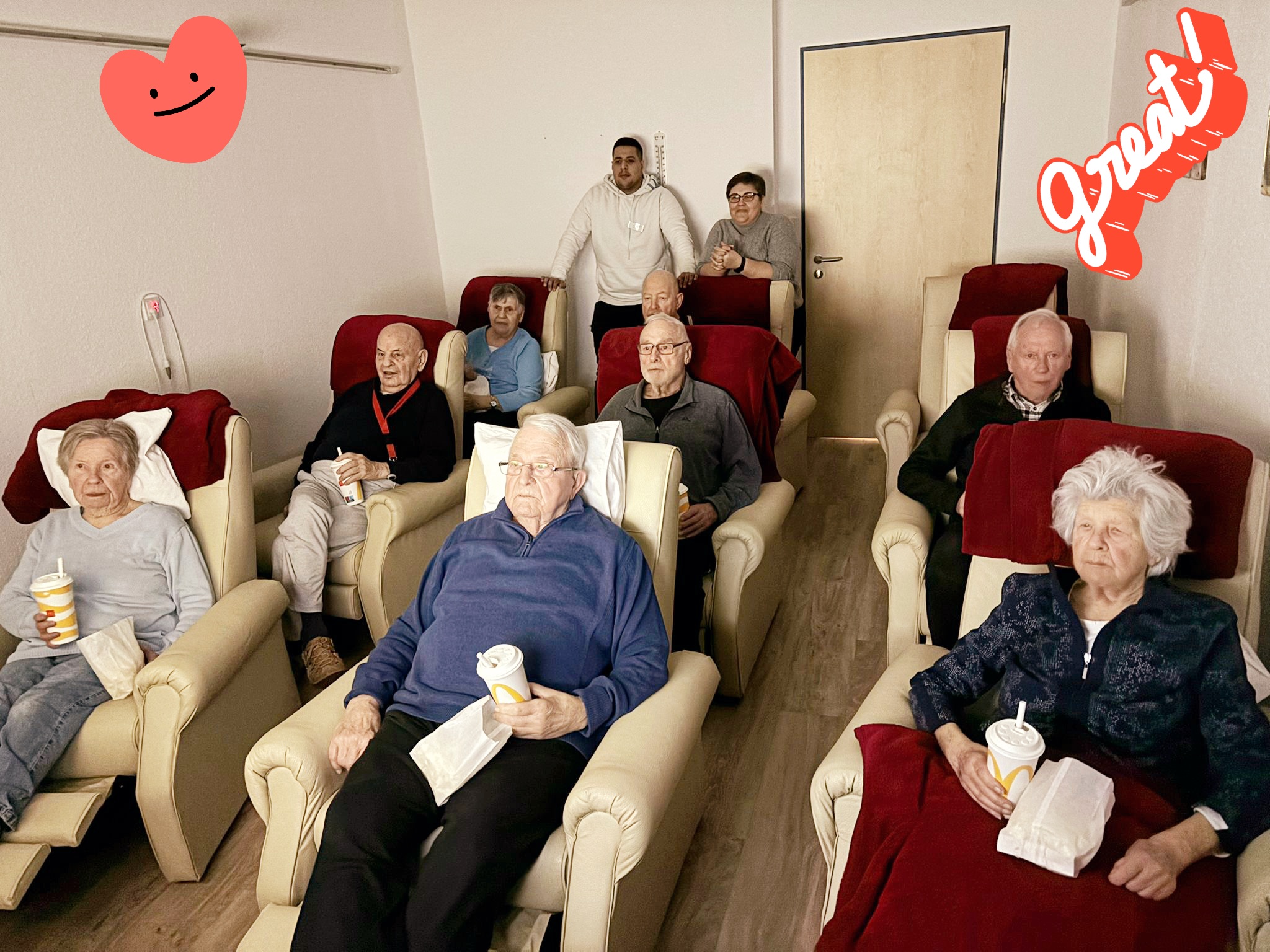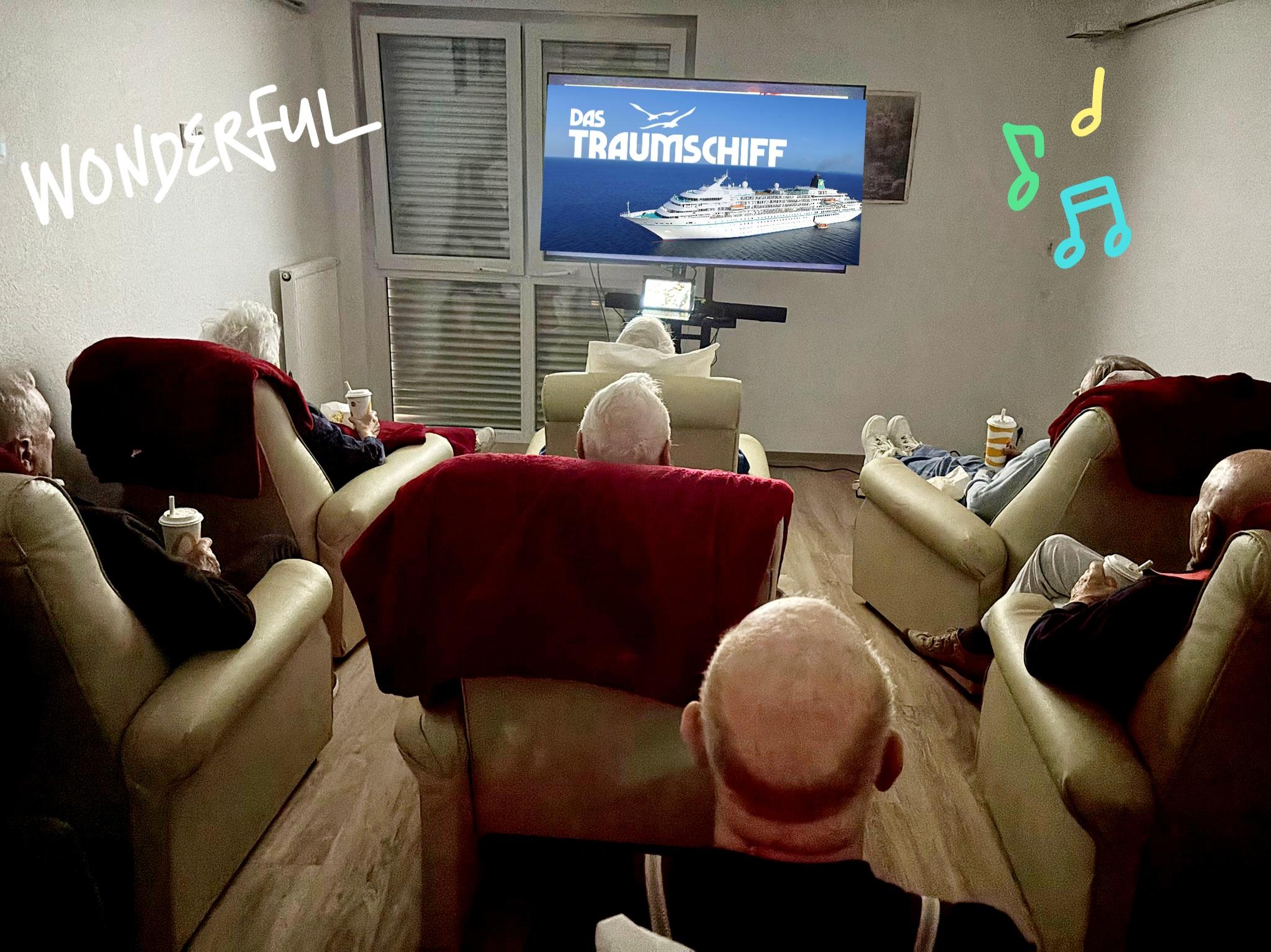Kino, wie es wirklich Spaß macht. Popcorn, Kaltgetränke, ein großer Bildschirm mit Soundbar, eine bequeme Sitzposition und dann Licht aus. Unsere Tagespflegedienstleitung Elisabeth Schmidt und ihr Team nahmen die Tagespflegegäste mit an Bord des „Traumschiffs“, das leider – 90 Minuten nach dem Ablegen – schon wieder verlassen werden musste.
