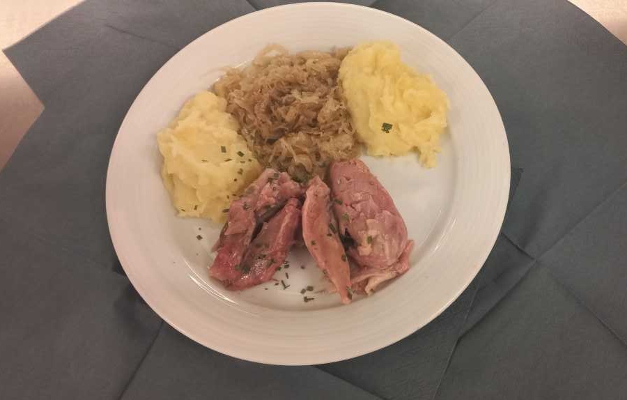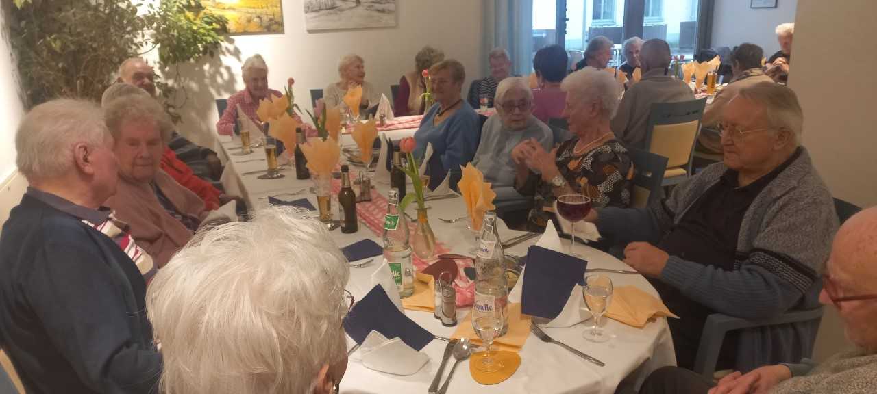Im Senioren-Park carpe diem in Mülheim laden wir einmal im Monat alle Mieter*innen zu einem gemütlichen Treffen in unser schönes Café ein. Unsere Küche verwöhnte mit einem winterlichen Drei-Gänge-Menü, das sich vor allem die Herren so gewünscht hatten: nach einer klaren wärmenden Brühe gab es Kartoffelstampf, Sauerkraut und Eisbein. Ein fruchtiger Eisbecher war dann der krönende Abschluss.