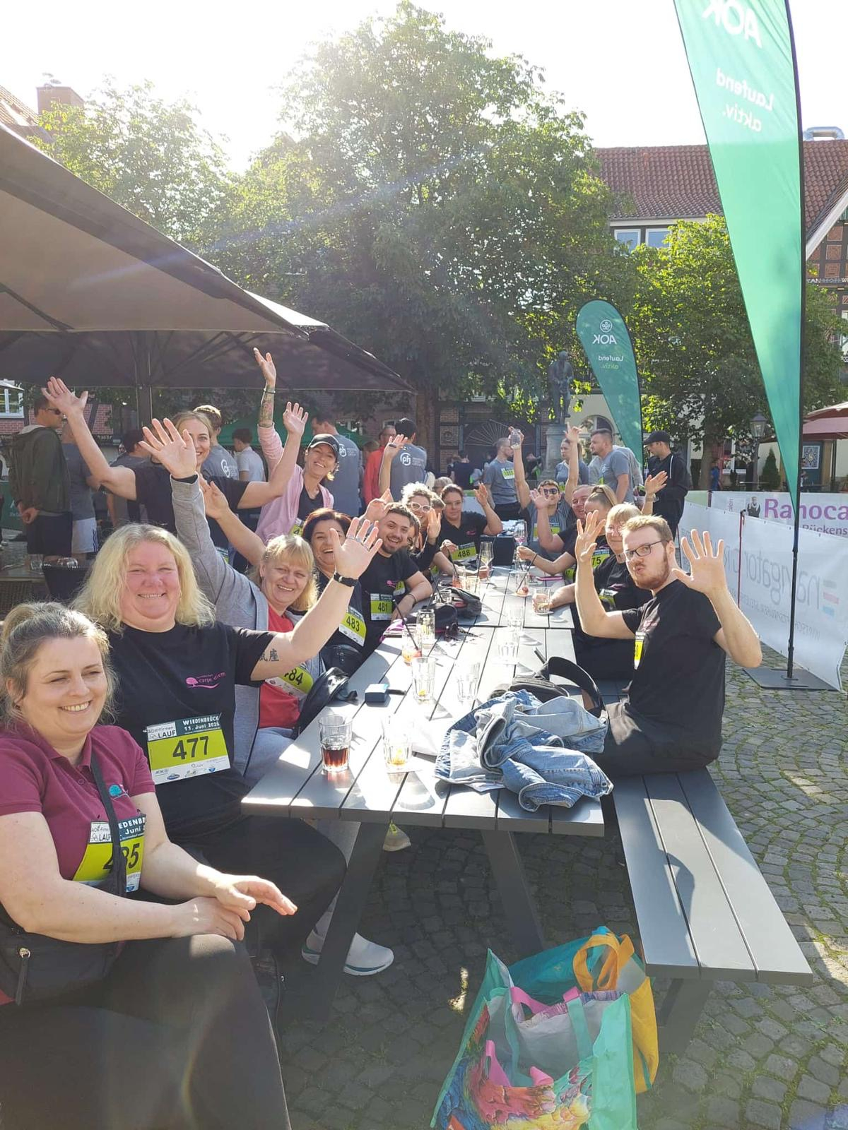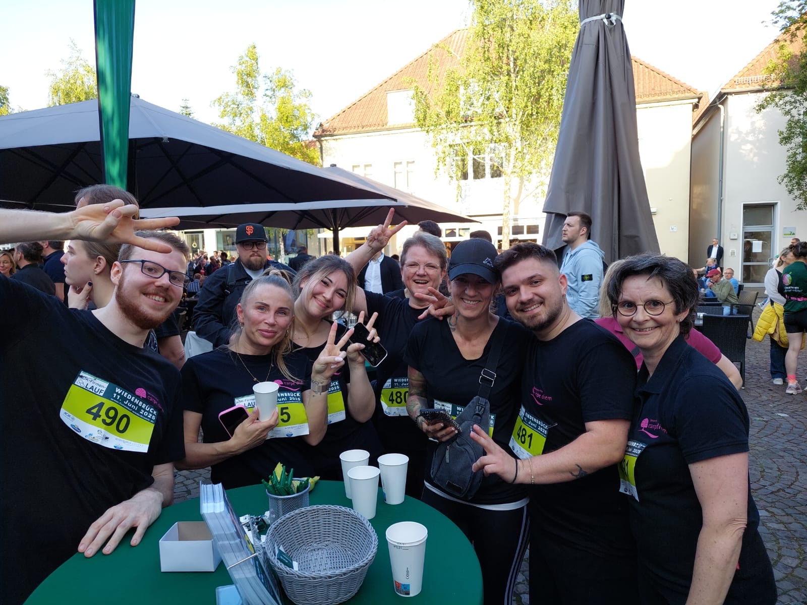 Bei perfekten Lauftemperaturen von 20°C machte sich auch eine kleine Truppe tapferer MitarbeiterInnen aus der Parkstraße 1 in Rheda auf nach Wiedenbrück, um mit Sports- und Teamgeist von sich zu überzeugen und neben dem Spaß auch potentielle neue KollegInnen auf sich aufmerksam zu machen. Mit großem Organisationstalent lotste die Pflegedienstleitung Laura Neuhaus ihr Team zügig von Parkplatz über Anmeldung zum Marktplatz auf dem das Event stattfand. So blieb noch genug Zeit mit leckeren Getränken auf ein gutes Gelingen anzustossen.