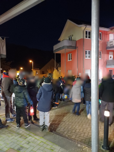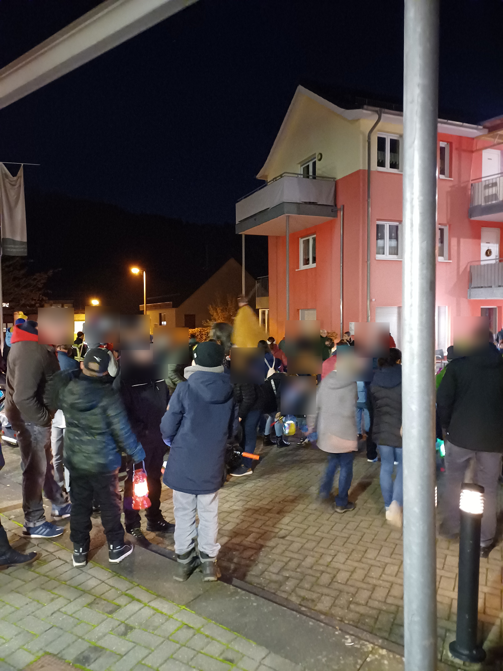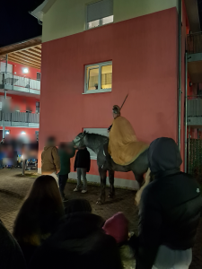 Später, am frühen Abend, versammelte sich die Dorfbevölkerung bei uns im Hof zum Start des Martinszuges. Die Bewohner konnten von den Balkonen zuschauen, oder draußen direkt im Geschehen sitzen. Wem es zu kalt war, schaute von drinnen zu.