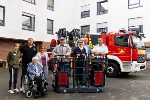 Vergangenen Freitag hatten unsere Bewohner und Bewohnerinnen die einmalige Gelegenheit, gemeinsam mit der Feuerwehr Jüchen und dem Bürgermeister Harald Zillikens hoch hinaus zu fahren – ganze 30 Meter in die Luft. Von dort oben eröffnete sich ein faszinierender Blick über die Dächer der Stadt.