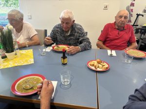 Das erste Gericht war eine Erbsensuppe, deren Duft durchs ganze Haus ging. Und so dauerte es nicht lange, dass sich die Plätze an den Tischen nach und nach füllten. Alle genossen die gute Suppe und das frische Brot. Selbst unser Bürgermeister Helmut Schmitt kam als Gast und ließ sich die Suppe schmecken.