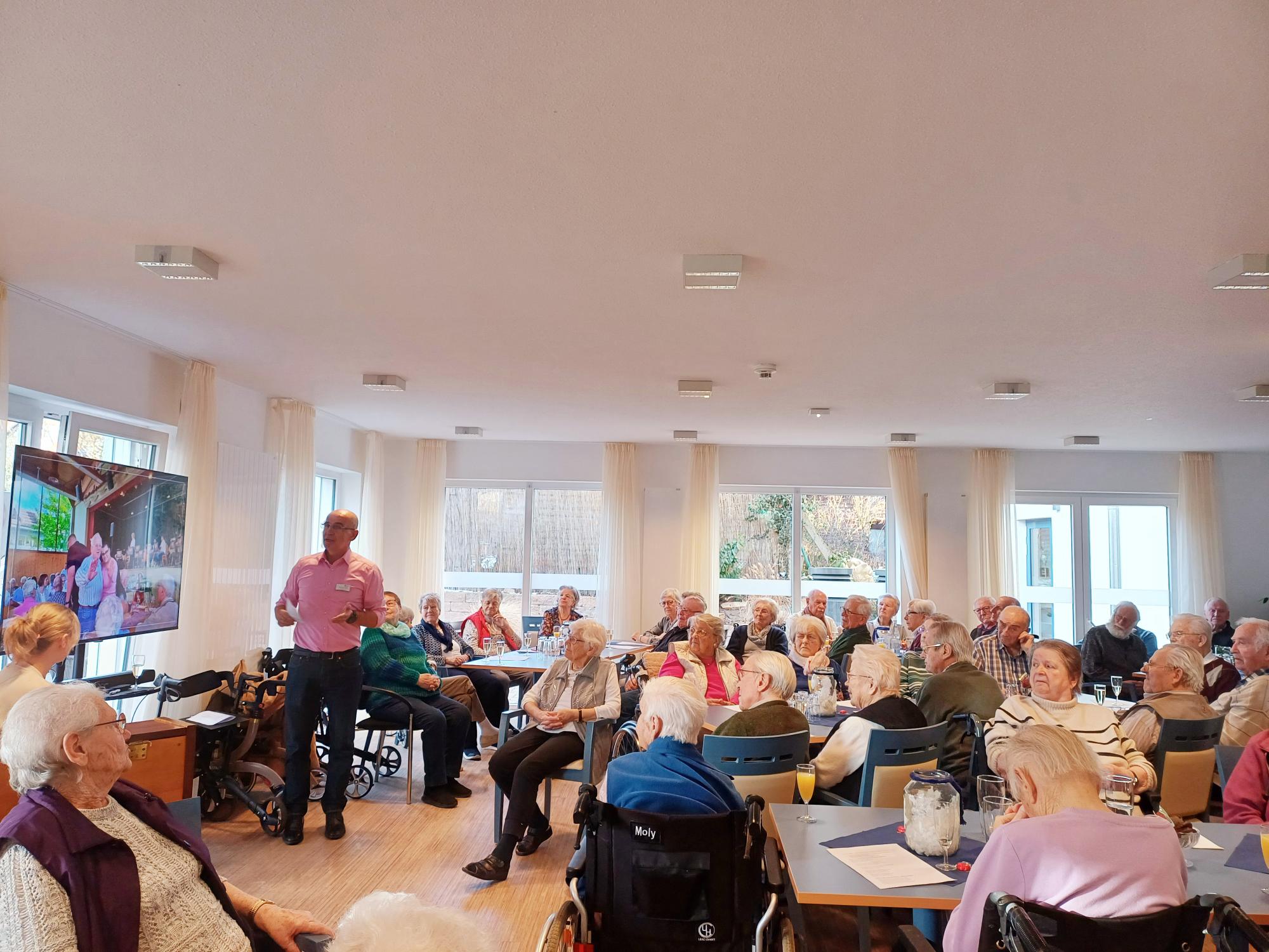 Beim Neujahrsempfang wurde im Café-Restaurant miteinander angestoßen, gesungen, Rückblick und Ausblick gehalten. Einrichtungsleiter Rolf Josef Thelen überbrachte die guten Wünsche der Geschäftsführung und führte durch das kurzweilige Programm. Der Chorleiter Dietmar Göring brachte uns mit der Ode an die Freude, Musik von Willy Schneider, Roy Black und Udo Jürgens zum Erinnern und Mitsingen. Bürgermeister Helmut Schmitt überbrachte die Neujahrsgrüße der Ortsgemeinde und lobt die Zusammenarbeit mit dem Träger und der Einrichtung.
