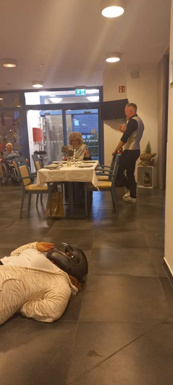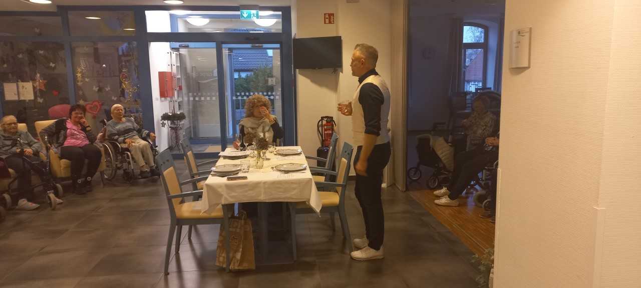 Es ist gute Tradition in Mülheim, am Silvesterabend den Klassiker „Dinner for one“ den Bewohner*innen und Mieter*innen live zu präsentieren, natürlich abgewandelt auf unsere Verhältnisse. Da feierte eine Bewohnerin mit imaginären Gästen (dieses Jahr waren es eine Zimmernachbarin, ein Diakon, ein ehemaliges Funkenmariechen und der ewige Verlobte) mit ruhrgebietstypischen Gerichten, und der Butler ist natürlich eine Pflegekraft, der das Fest liebevoll mit allen Konsequenzen begleitet. Es machte auch in diesem Jahr riesengroße Freude zu sehen, wie viel Herzblut und schauspielerisches Talent die Kollegen in ihre Rollen einbringen, da blieb kein Auge trocken, wenn es wieder hieß: “Datt gleiche Prozedere wie jedet Jahr?”