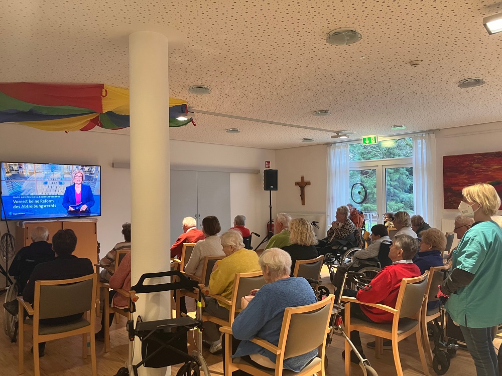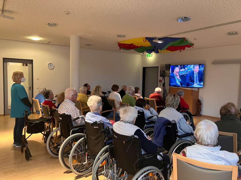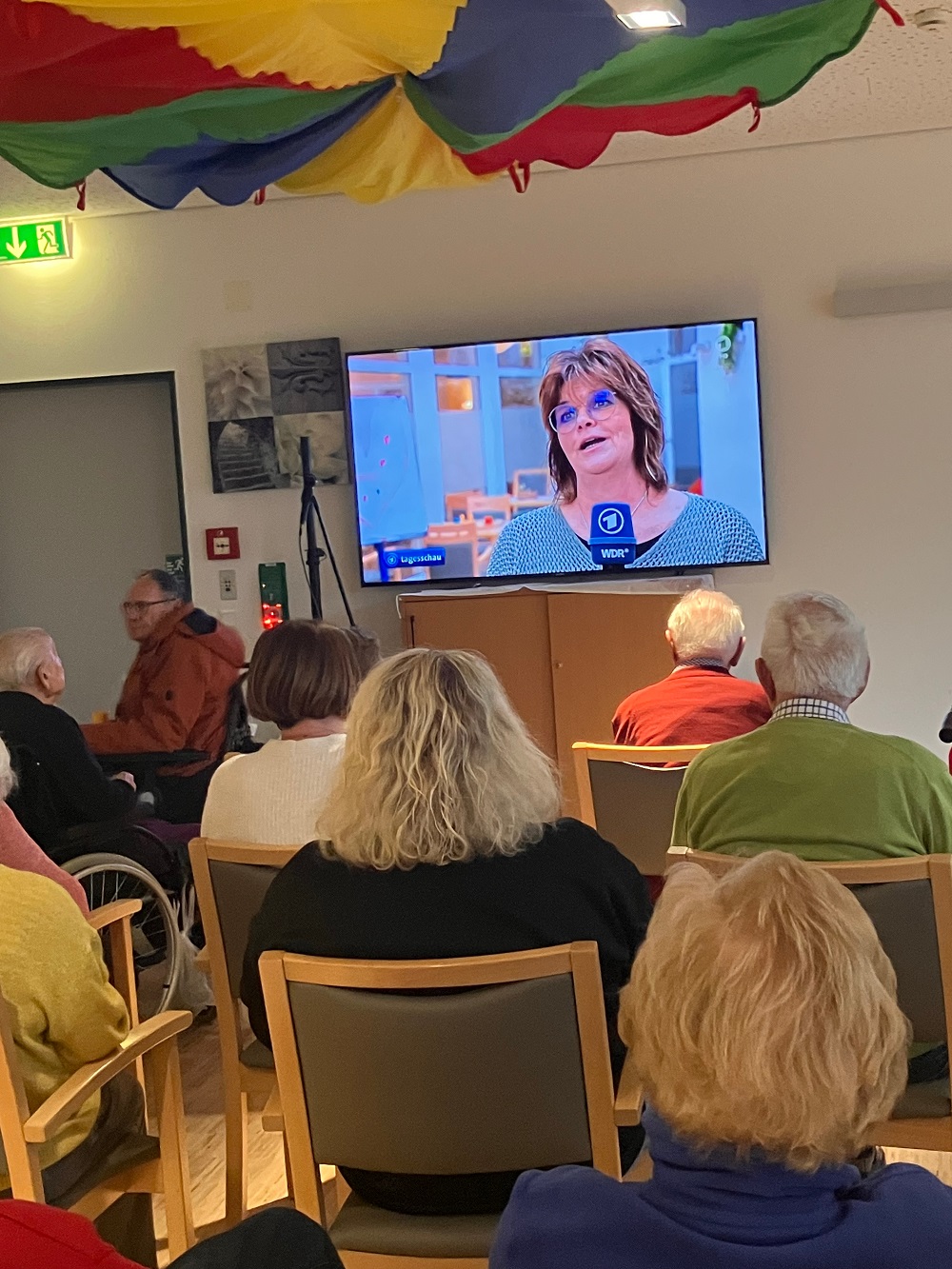 So traf man sich zum Public Viewing mit Bratwurst und Getränken am Dienstag im Saal, um gemeinsam die Tageschau um 12:00 Uhr anzusehen. Auch die Angehörigen und MitarbeiterInnen waren eingeladen, und so war der Raum gut gefüllt.