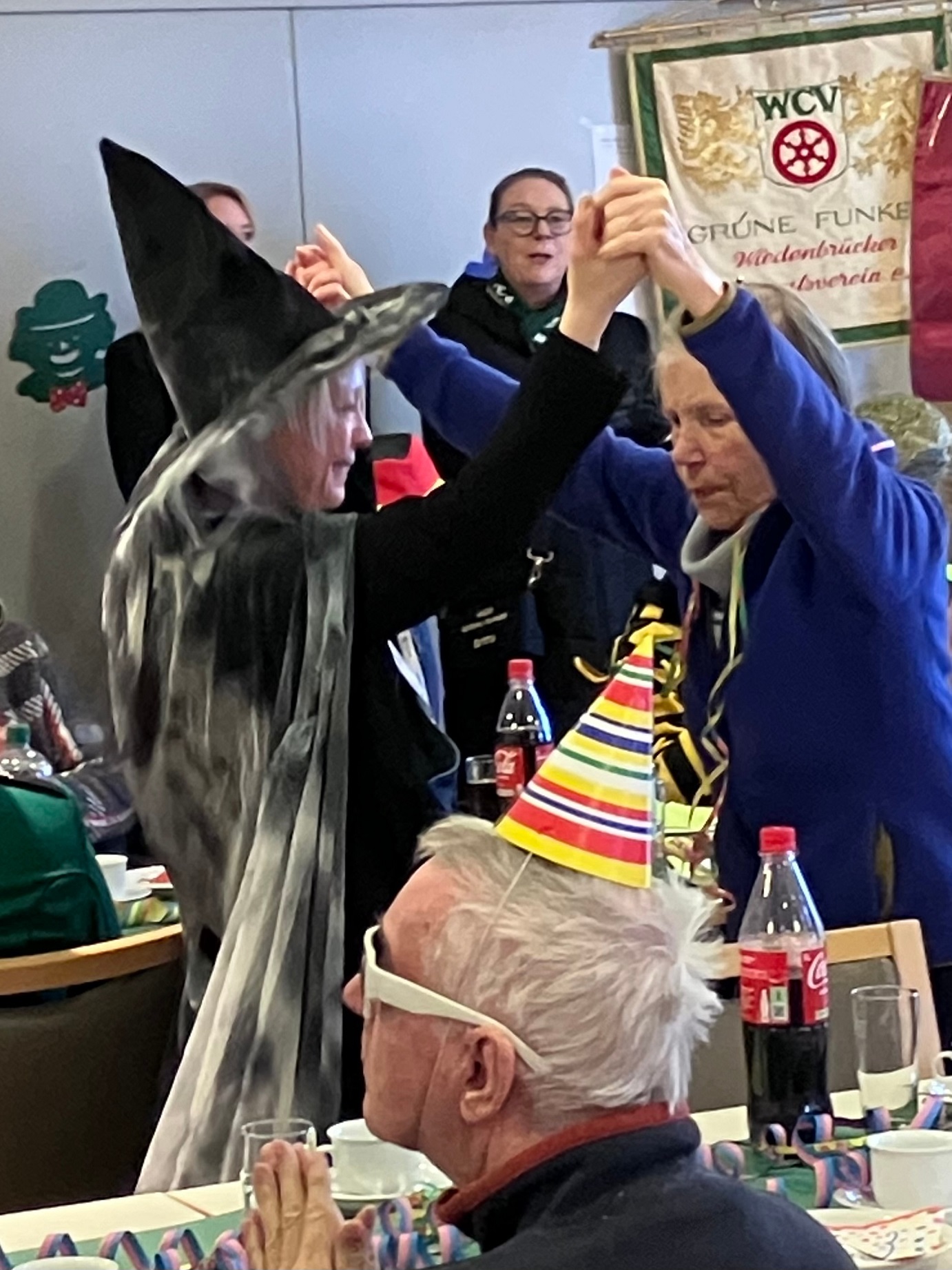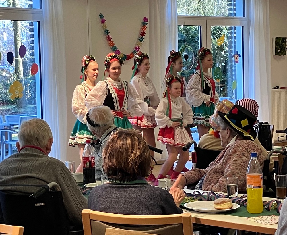 Am Sonntag dann trafen sich alle BewohnerInnen, die konnten und wollten, in dem großen Saal im Erdgeschoß zur offiziellen Karnevalsfeier. Viele Mitarbeitende und auch einige Angehörige haben mitgeholfen, mitgefeiert und damit zum guten Gelingen beigetragen.