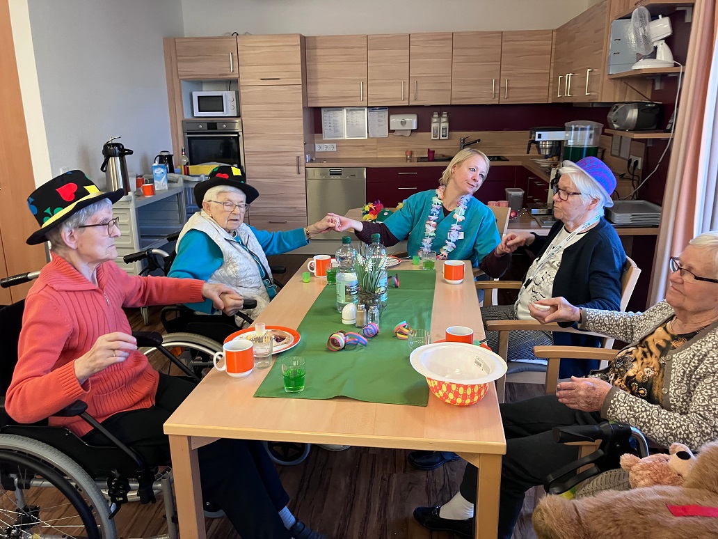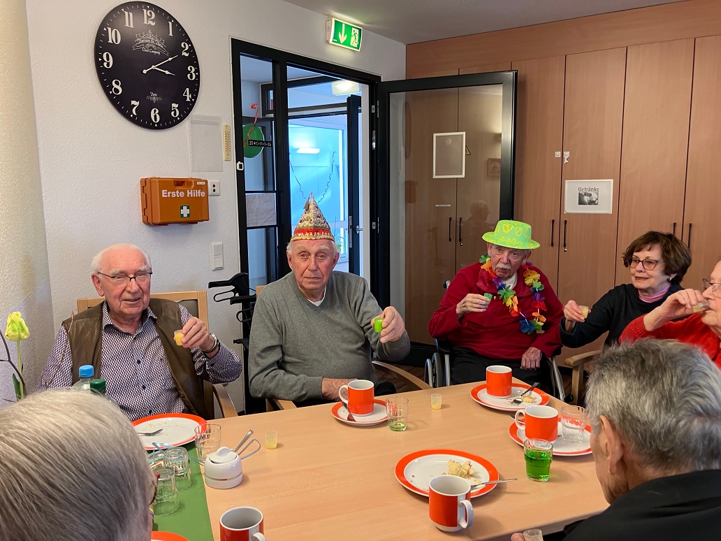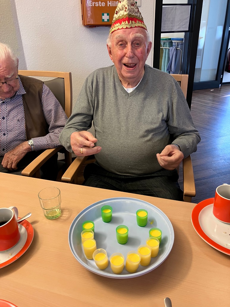 Nachmittags ging es weiter mit “Karneval auf den Wohnbereichen”. Bei Kaffee und Kuchen und einem (oder auch einem zweiten) Eierlikör ging es auch in der Wohnküche auf der 2. Etage fröhlich zu.
