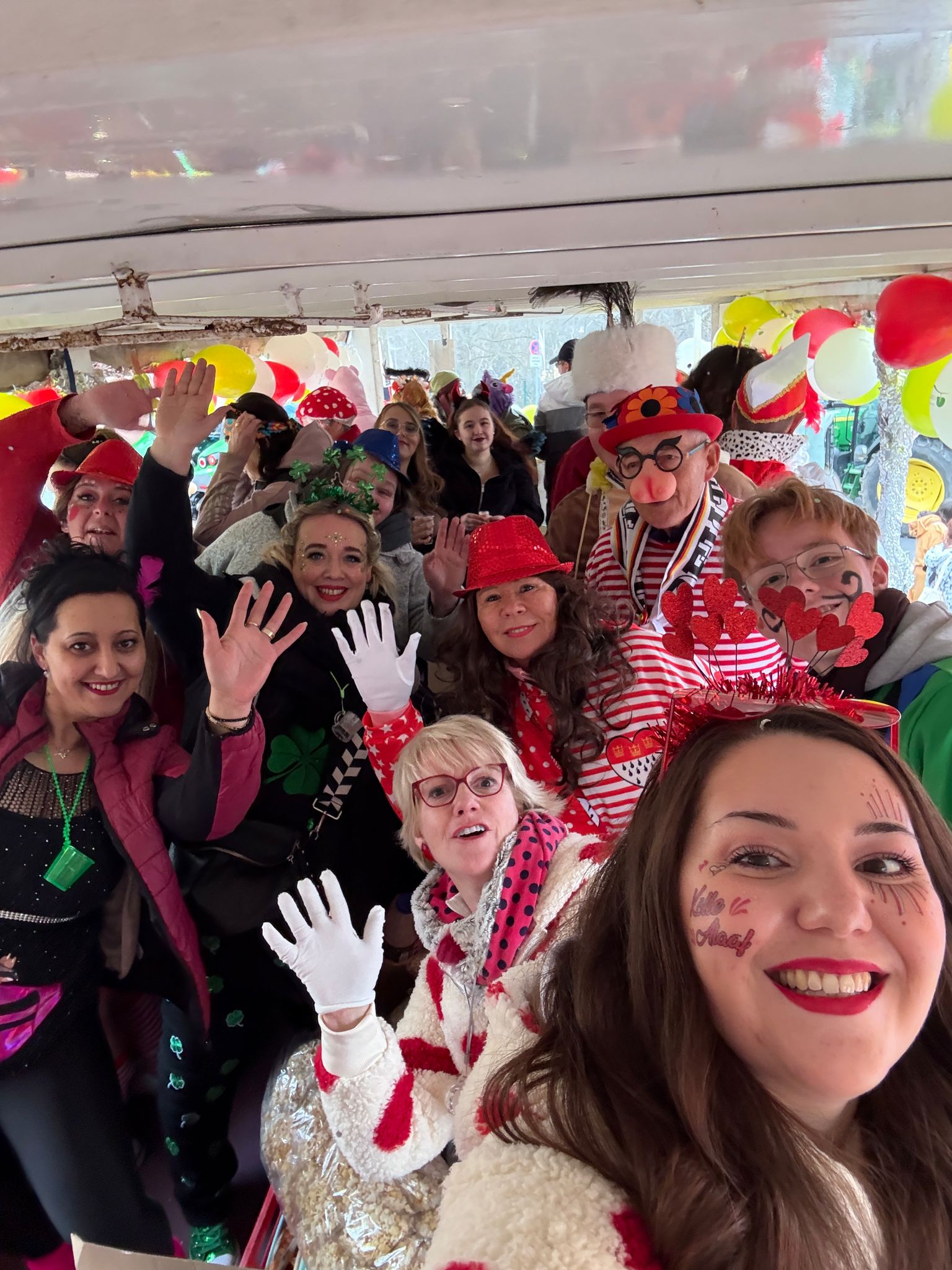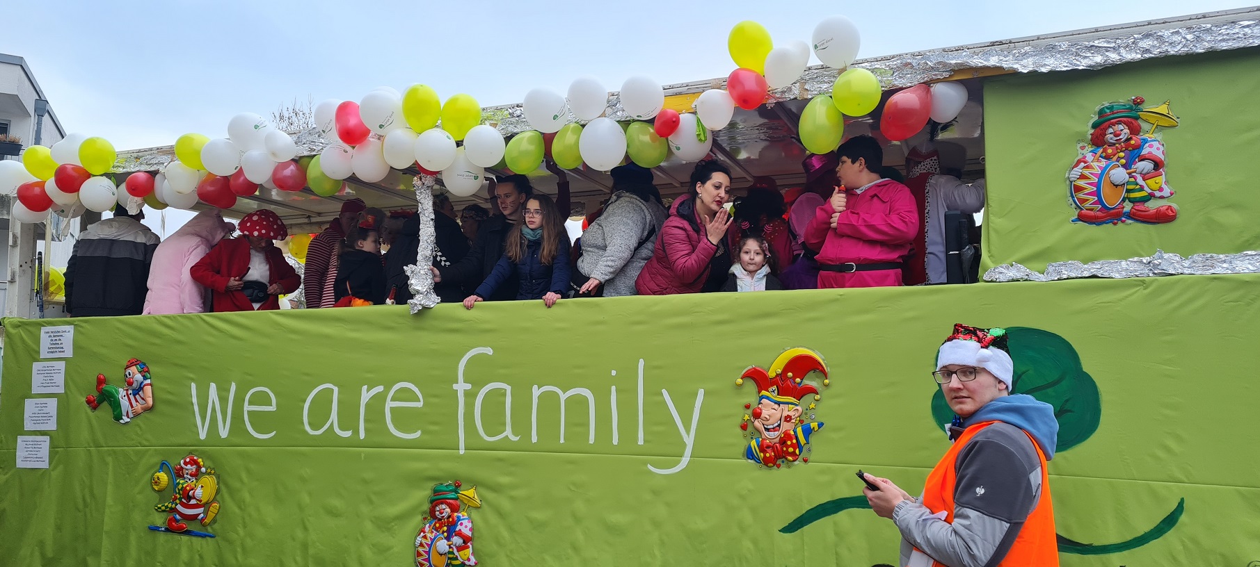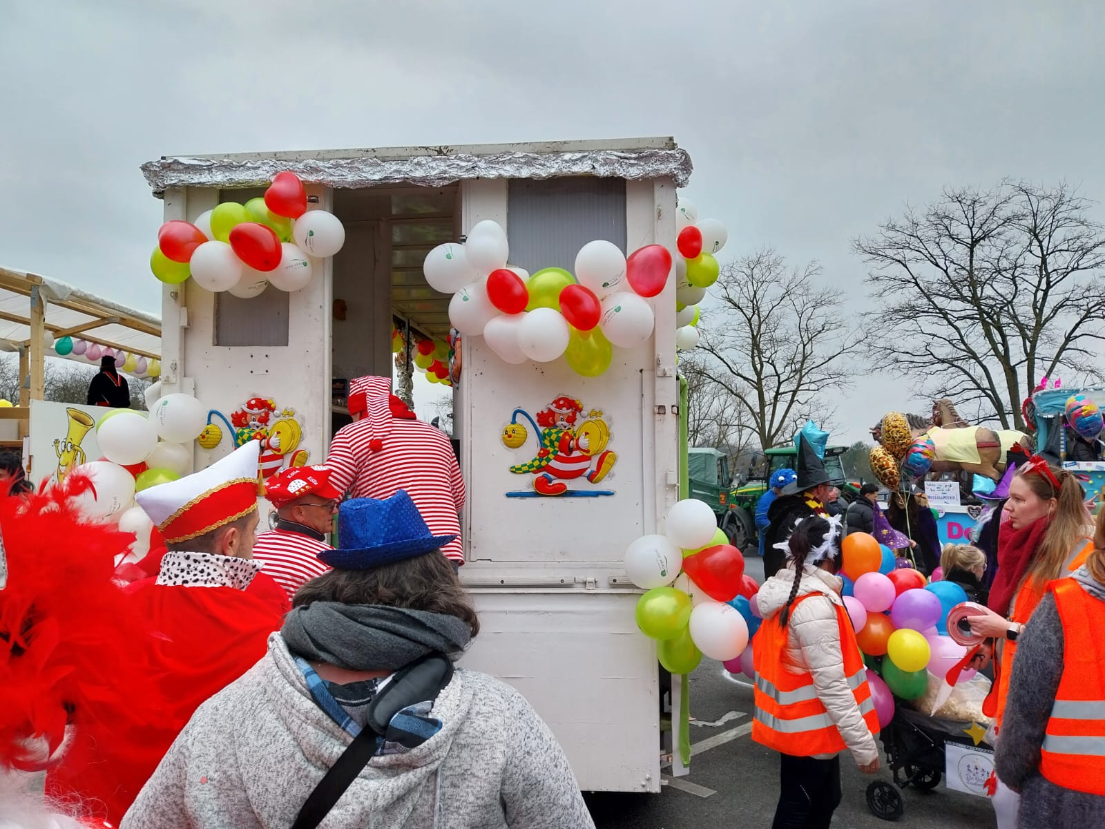 Einige Mitarbeitende kamen auf den genialen Gedanken, Sponsoren für das Wurfmaterial und die Dekoration des Wagens zu finden. Unzählige Telefonate wurden geführt, einige mögliche Sponsoren wurden persönlich angesprochen. Danach wurde es erst einmal etwas ruhiger und wir waren sehr gespannt, von wem wir eine positive Rückmeldung bekommen würden. Doch bald kam Bewegung in diese Aktion und wir erhielten Geldspenden und eine unglaublich große Menge an Wurfmaterial – vor allem von unseren Dienstleistern. Zwei Mitarbeitende fuhren extra nach Köln in „Die Kamellebud“, um dort sehr kostengünstig weiteres Wurfmaterial einzukaufen. Ein riesengroßes Dankeschön an unsere Sponsoren, die sich ihres sozialen Engagements durchaus bewusst geworden sind. Sie haben es uns, zusammen mit Jens-Christian Holtgreve (Mettmann Impulse) erst ermöglicht, in diesem Jahr am Karnevalsumzug teilzunehmen – und natürlich an unsere Mitarbeitenden. Unser Motto „We are family“ hätte passender nicht sein können. Wir waren ein tolles Team und wie eine große Familie.
